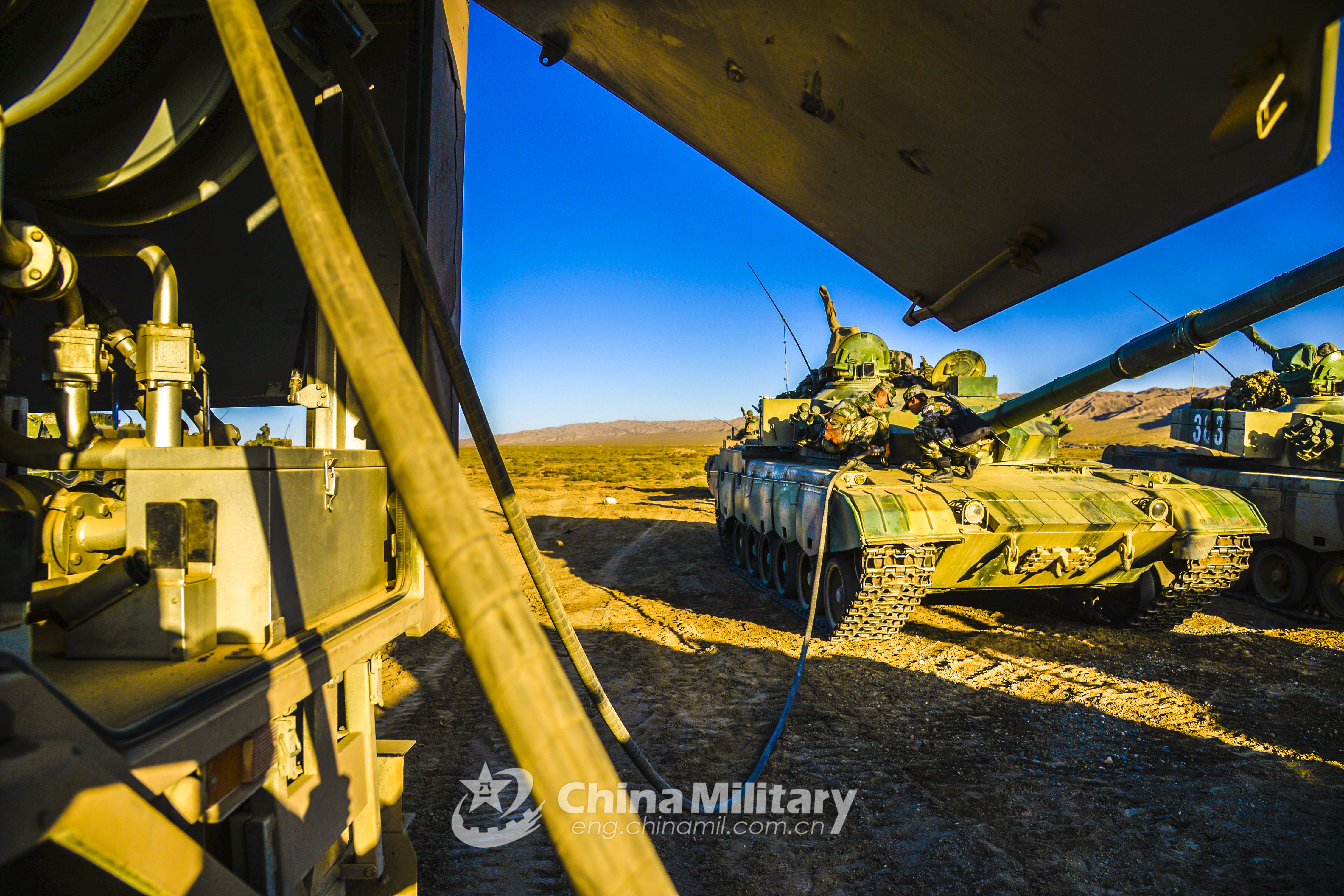 Soldiers assigned to a combined battalion of a brigade under the PLA 76th Group Army move a main battle tank into position to be loaded with tank fuel during a long-distance maneuver operation from September 20 to 22, 2019. The armored vehicle convoy conducted such subjects as round-the-clock tactical operation, command and coordinated operations, long-distance maneuver, integrated protection, joint assault operations and so on en route to the designated training field. (eng.chinamil.com.cn/Photo by Zhu Bin)