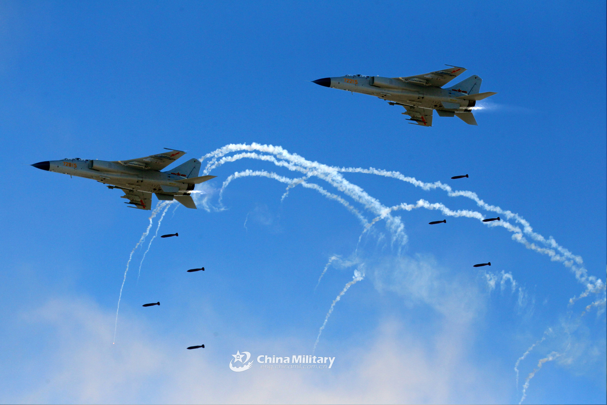 Two JH-7 fighter bombers attached to the 76th Group Army under the PLA Western Theater Command fire rockets at mock ground targets during the Tsentr-2019 (Center-2019) strategic drills. The drills ran in the Orenburg Region in Russia from September 16 to 21, with 128,000 troops, 20,000 pieces of military equipment, 600 aircraft and 15 naval and supply ships involved. Contingents from India, Kazakhstan, Kyrgyzstan, China, Pakistan, Tajikistan and Uzbekistan were taking part. China sent 1,600 troops to participate. (eng.chinamil.com.cn/Photo by Luo Shunyu)