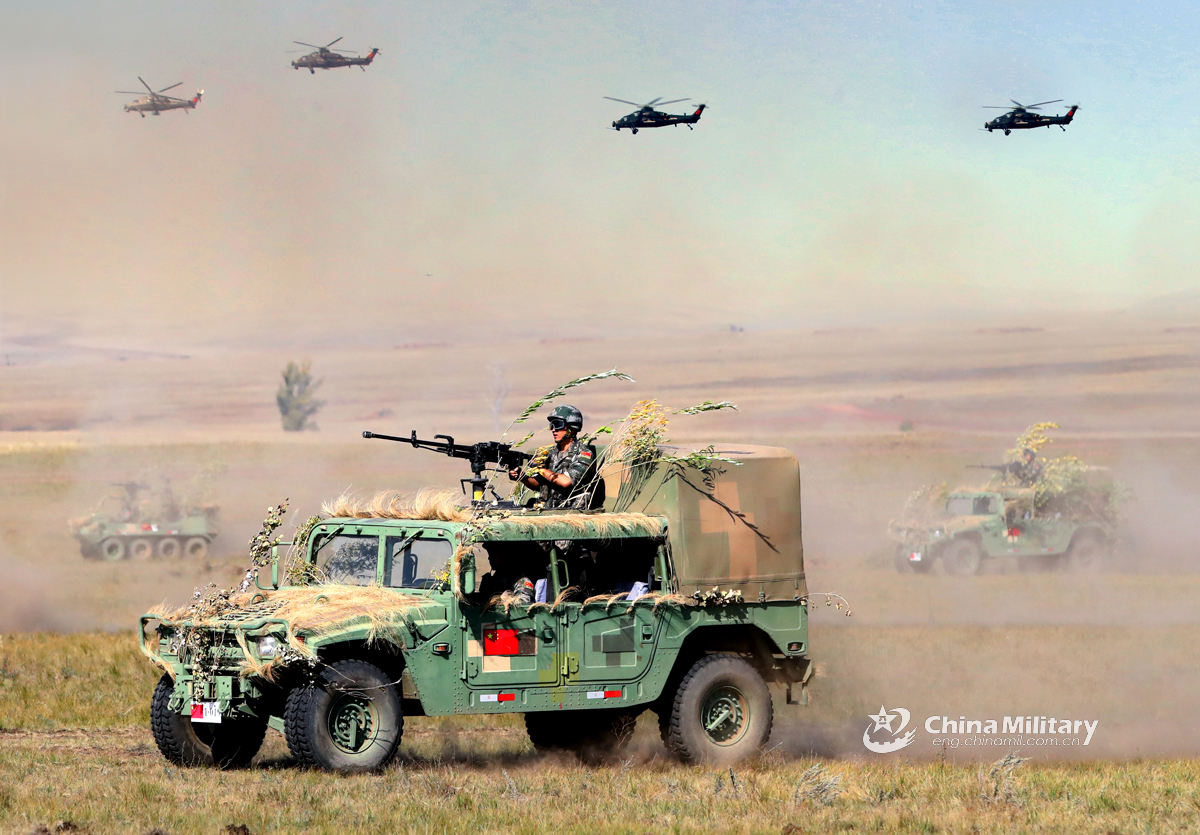 Soldiers assigned to the 76th Group Army under the PLA Western Theater Command maneuver to assault as Z-10 helicopters fly overhead during the Tsentr-2019 (Center-2019) strategic drills. The drills ran in the Orenburg Region in Russia from September 16 to 21, with 128,000 troops, 20,000 pieces of military equipment, 600 aircraft and 15 naval and supply ships involved. Contingents from India, Kazakhstan, Kyrgyzstan, China, Pakistan, Tajikistan and Uzbekistan were taking part. China sent 1,600 troops to participate.(eng.chinamil.com.cn/Photo by Luo Shunyu)