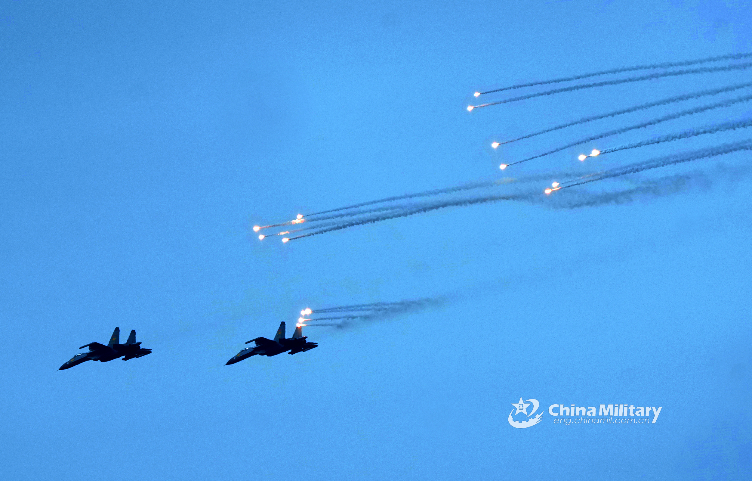Two J-11 fighter jets attached to the 76th Group Army under the PLA Western Theater Command fire off decoy flares during the Tsentr-2019 (Center-2019) strategic drills. The drills ran in the Orenburg Region in Russia from September 16 to 21, with 128,000 troops, 20,000 pieces of military equipment, 600 aircraft and 15 naval and supply ships involved. Contingents from India, Kazakhstan, Kyrgyzstan, China, Pakistan, Tajikistan and Uzbekistan were taking part. China sent 1,600 troops to participate. (eng.chinamil.com.cn/Photo by Luo Shunyu)