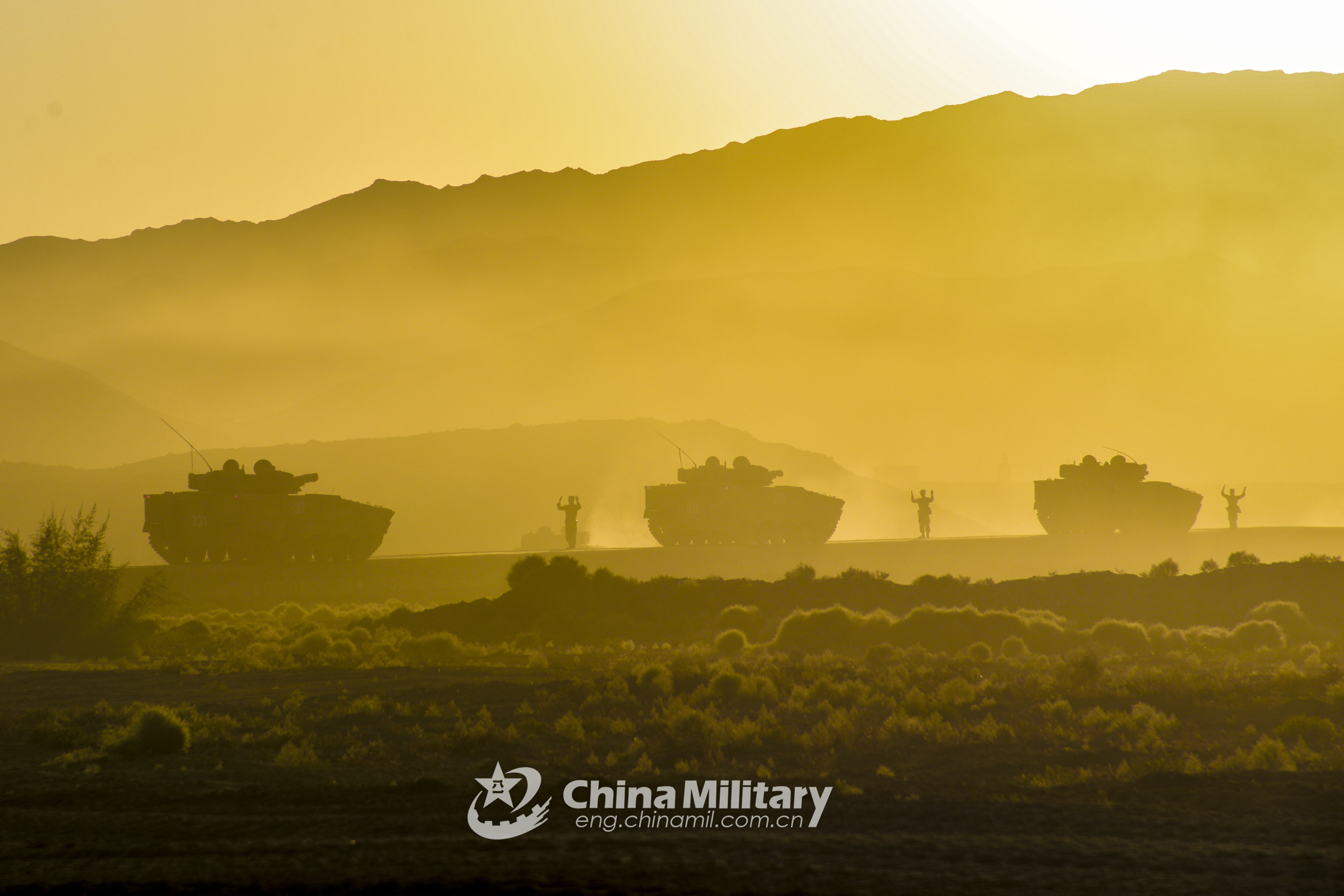 Soldiers assigned to a combined battalion of a brigade under the PLA 76th Group Army direct armored vehicles to rumble onto mock railway cart during long-distance maneuver training from September 24 to 25, 2019. (eng.chinamil.com.cn/Photo by Zhu Bin)