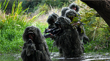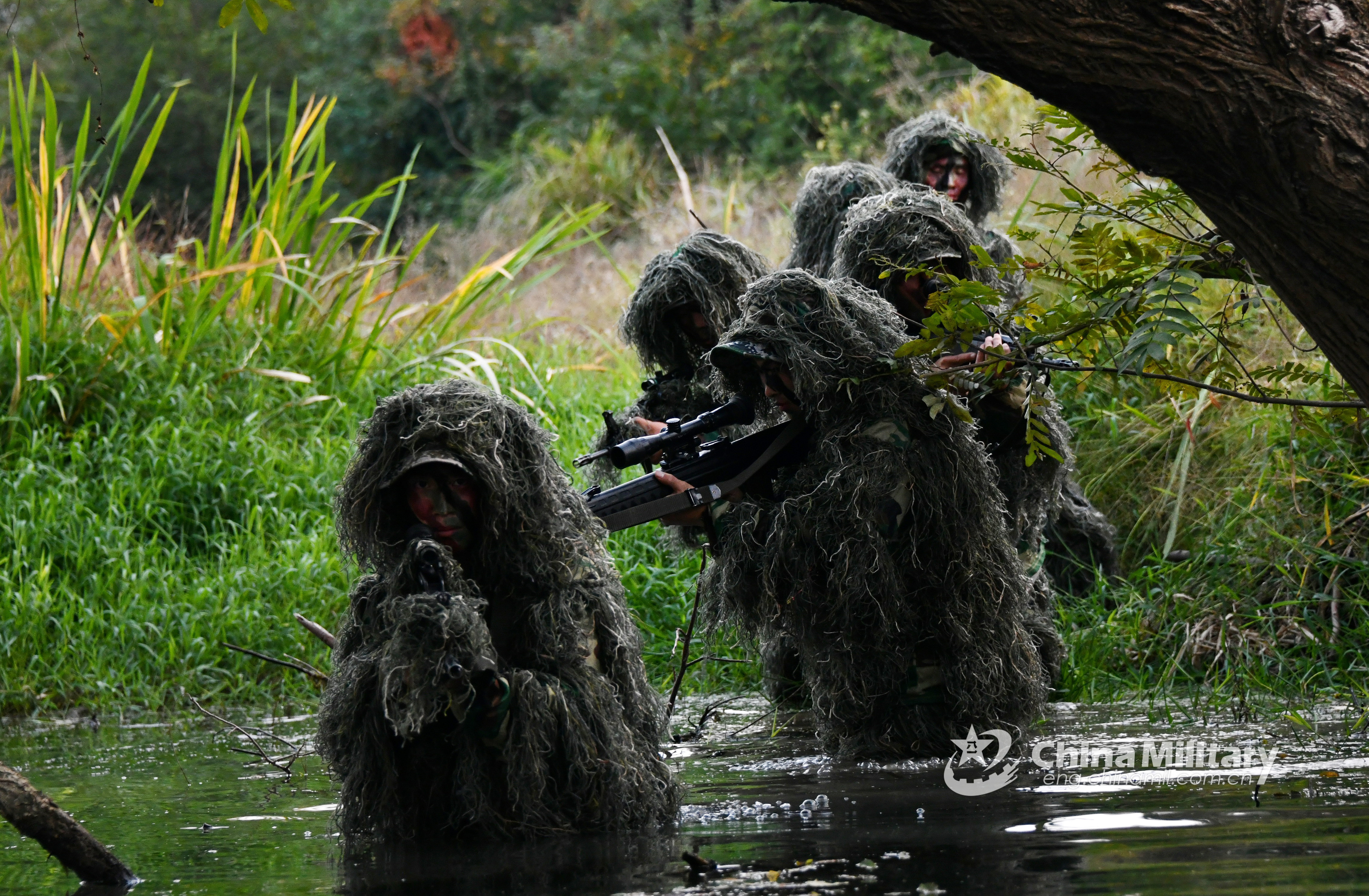 Snipers wearing ghillie suits, a type of camouflage, advance in an amphibious assault to ambush mock targets, while their squads provide cover during a field reconnaissance training exercise conducted by a brigade under the PLA 72nd Group Army from November 3 to 7, 2019. (eng.chinamil.com.cn/Photo by Shi Yaxiang)