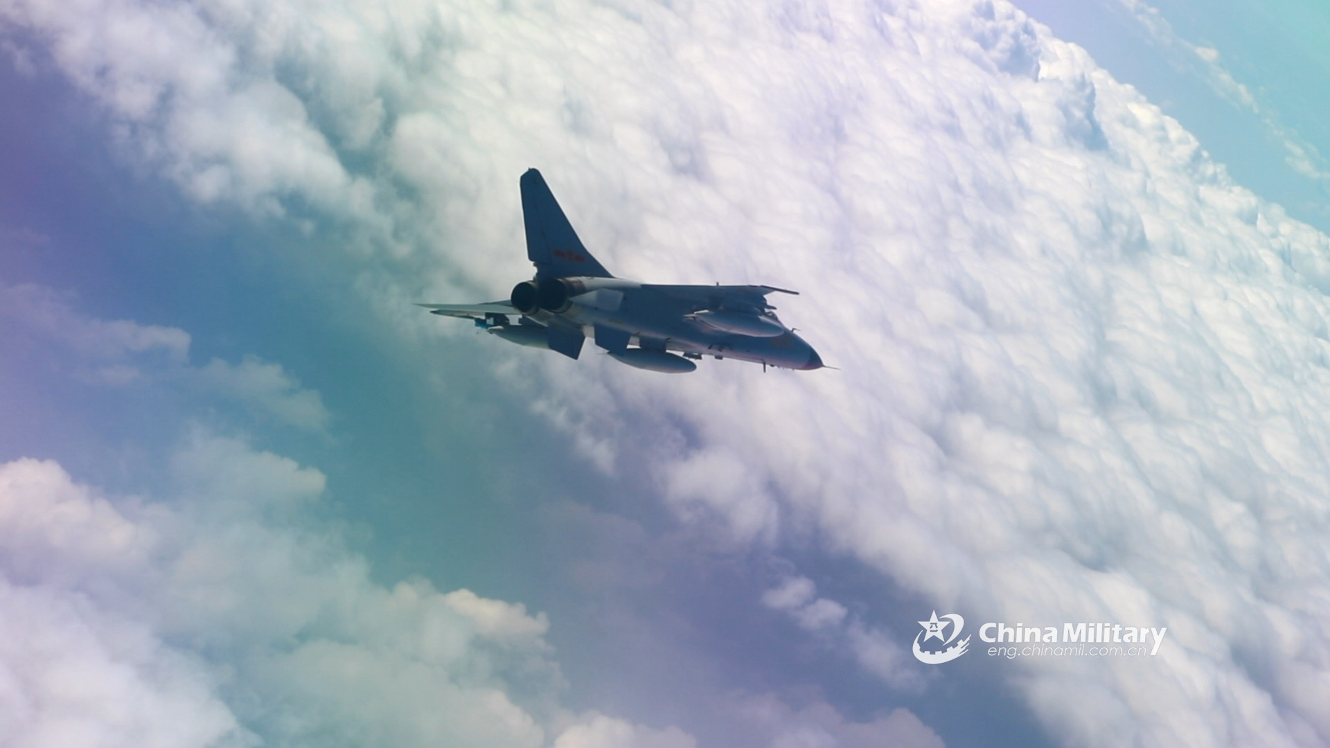 A JH-7 fighter bomber attached to an aviation brigade of the air force under the PLA Southern Theater Command soars over the sky during a recent flight training exercise. (eng.chinamil.com.cn/Photo by Wang Chen and Huang Yanzhaung)