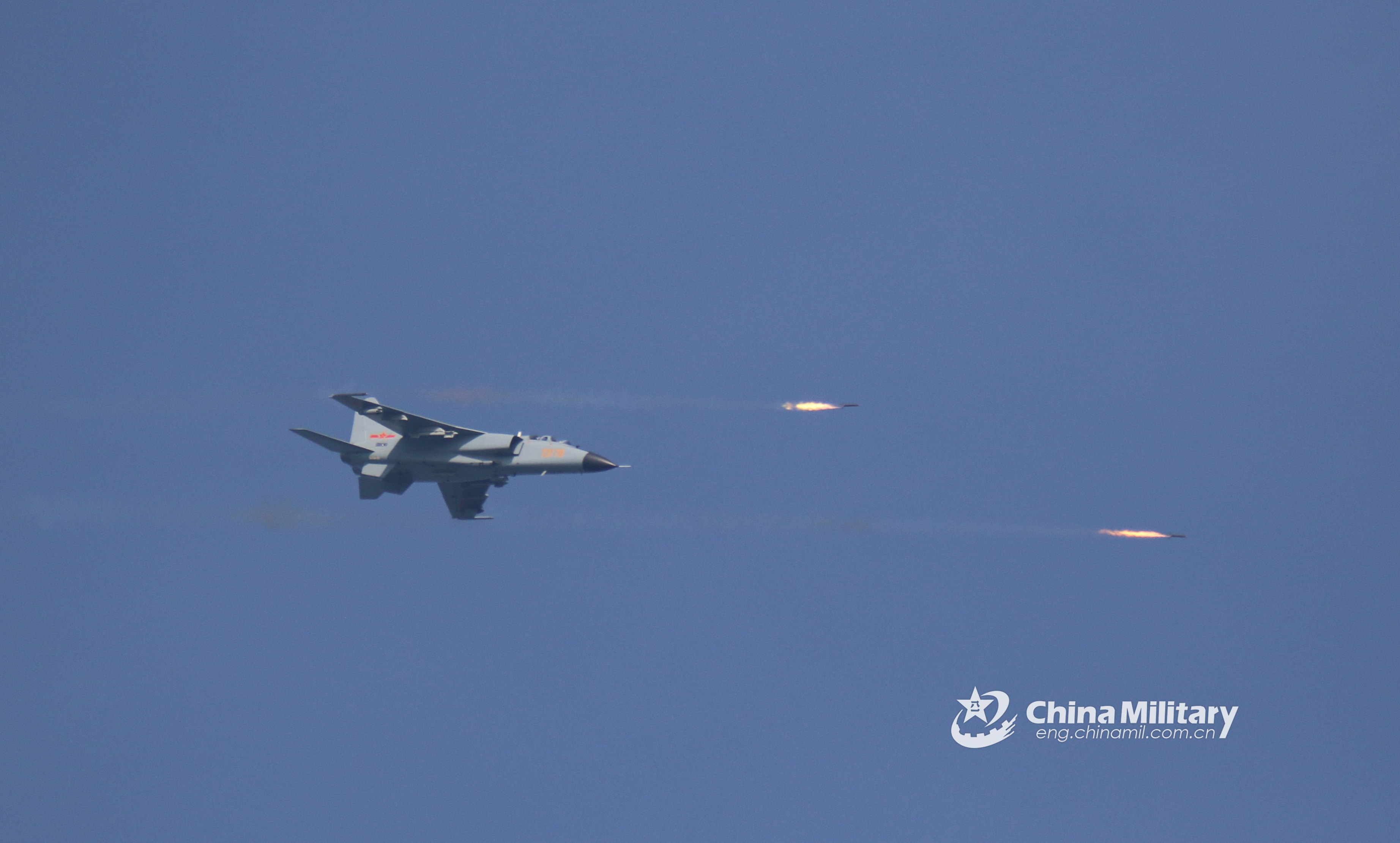 A JH-7 fighter bomber attached to an aviation brigade of the air force under the PLA Southern Theater Command fires its aircraft gun at mock aerial targets during a recent flight training exercise. (eng.chinamil.com.cn/Photo by Wang Chen and Huang Yanzhaung)
