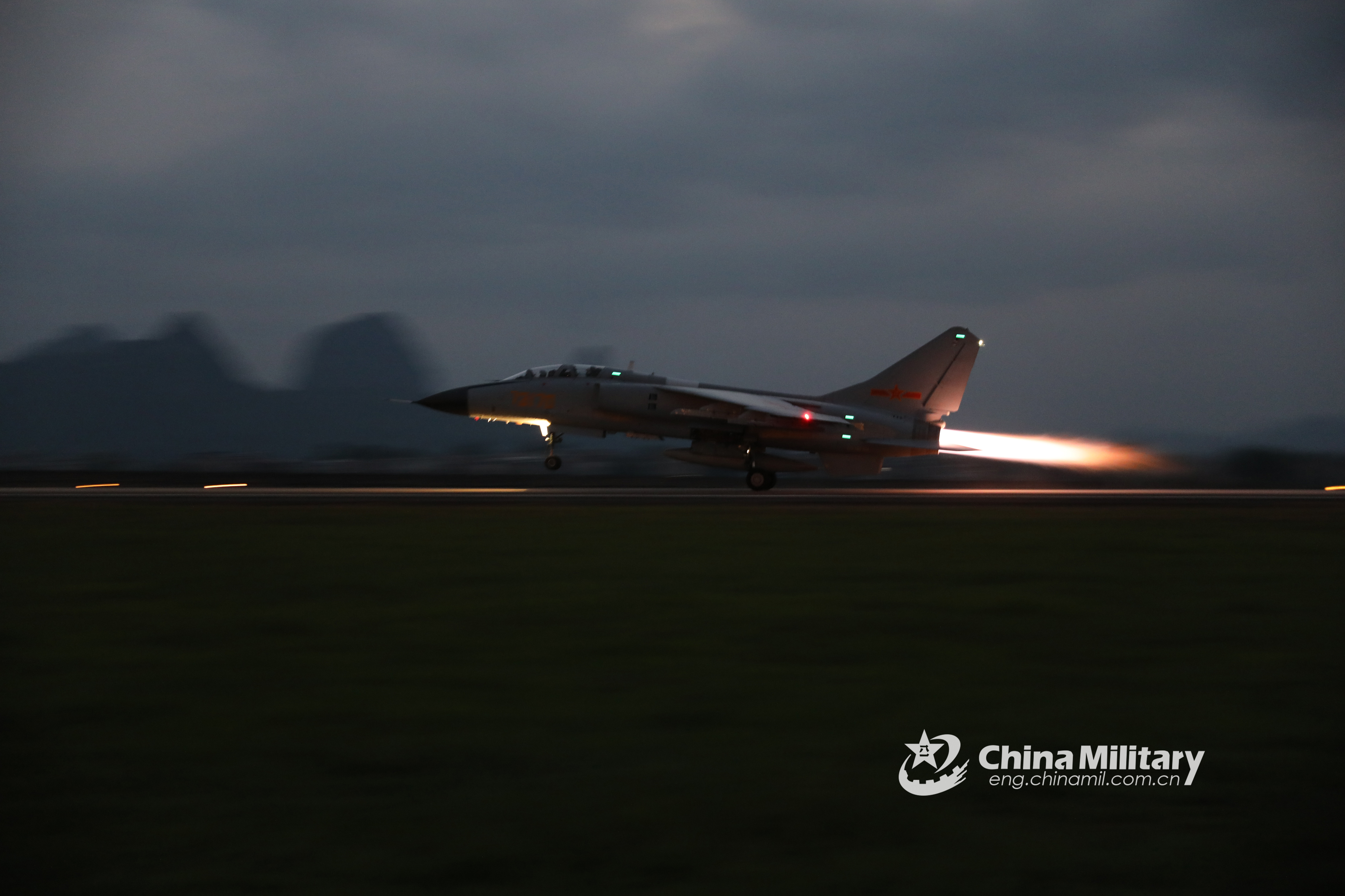 A JH-7 fighter bomber attached to an aviation brigade of the air force under the PLA Southern Theater Command prepares to take off from the runway at night during a recent flight training exercise. (eng.chinamil.com.cn/Photo by Wang Chen and Huang Yanzhaung)