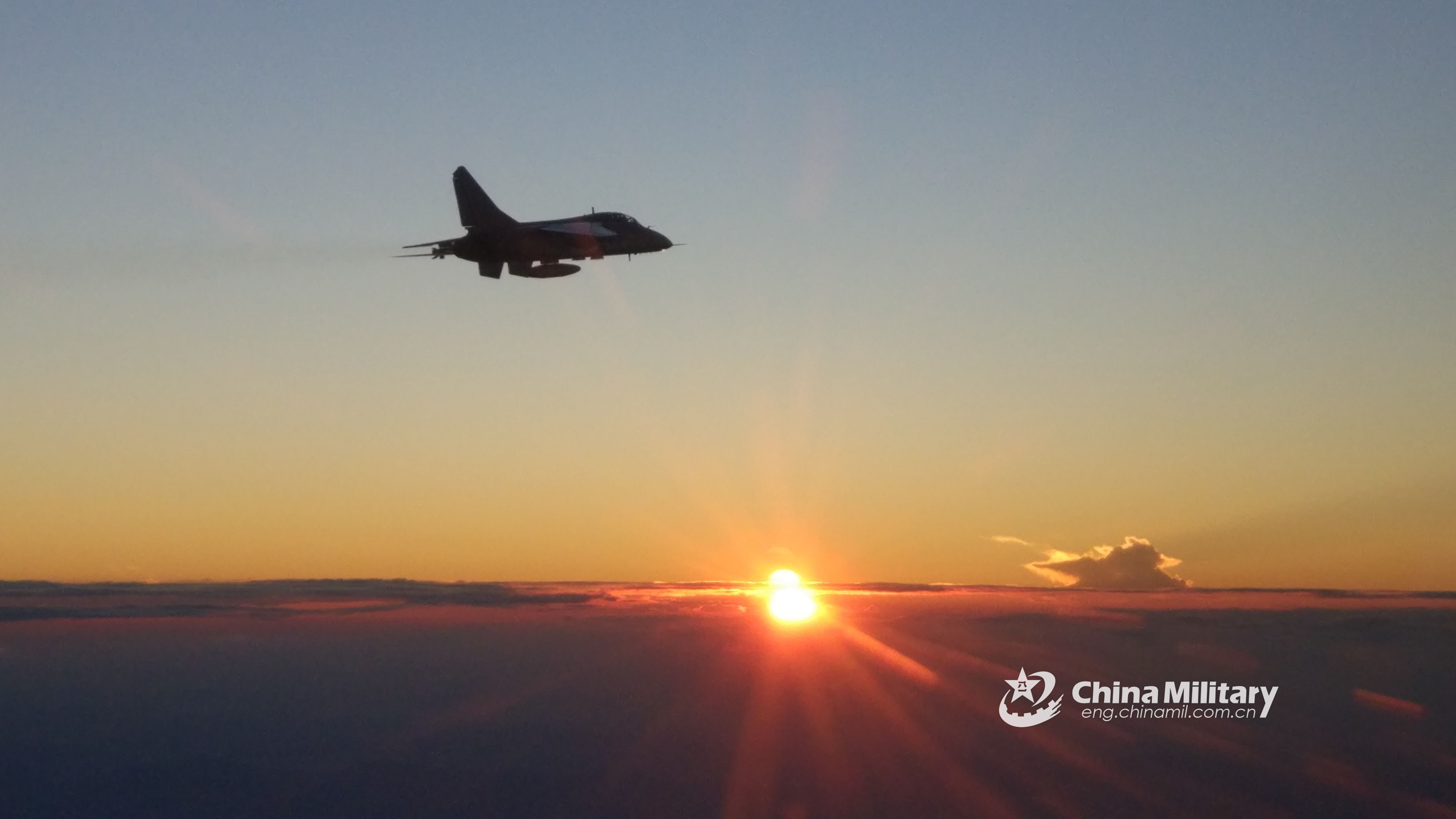 A JH-7 fighter bomber attached to an aviation brigade of the air force under the PLA Southern Theater Command soars above the cloud at sunset during a recent flight training exercise. (eng.chinamil.com.cn/Photo by Wang Chen and Huang Yanzhaung)