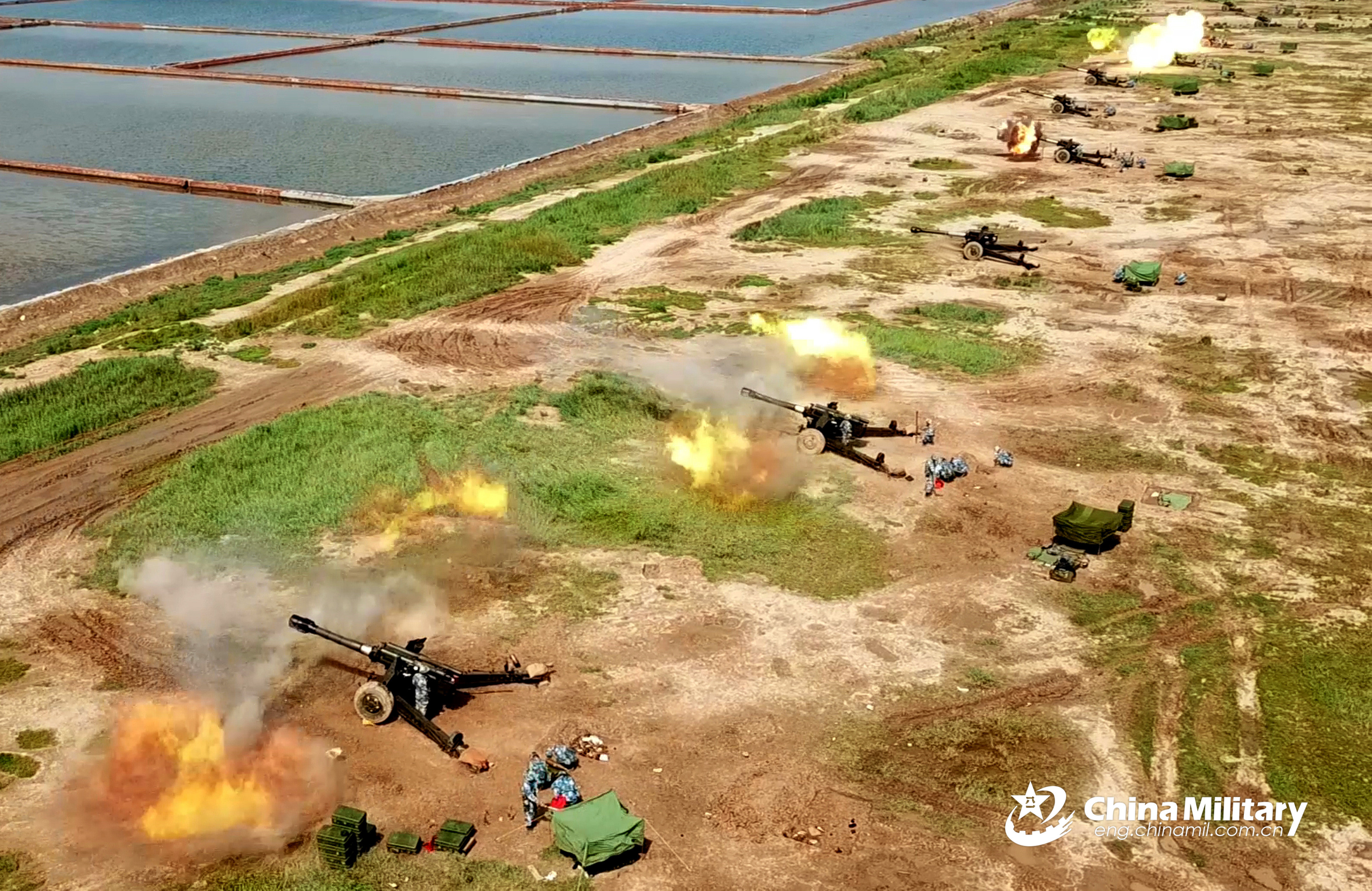 Towed howitzers attached to a brigade of Marine Corps under the PLA Navy fire simultaneously at mock targets during a recent live-fire training exercise. (eng.chinamil.com.cn/Photo by Shang Wenbin)