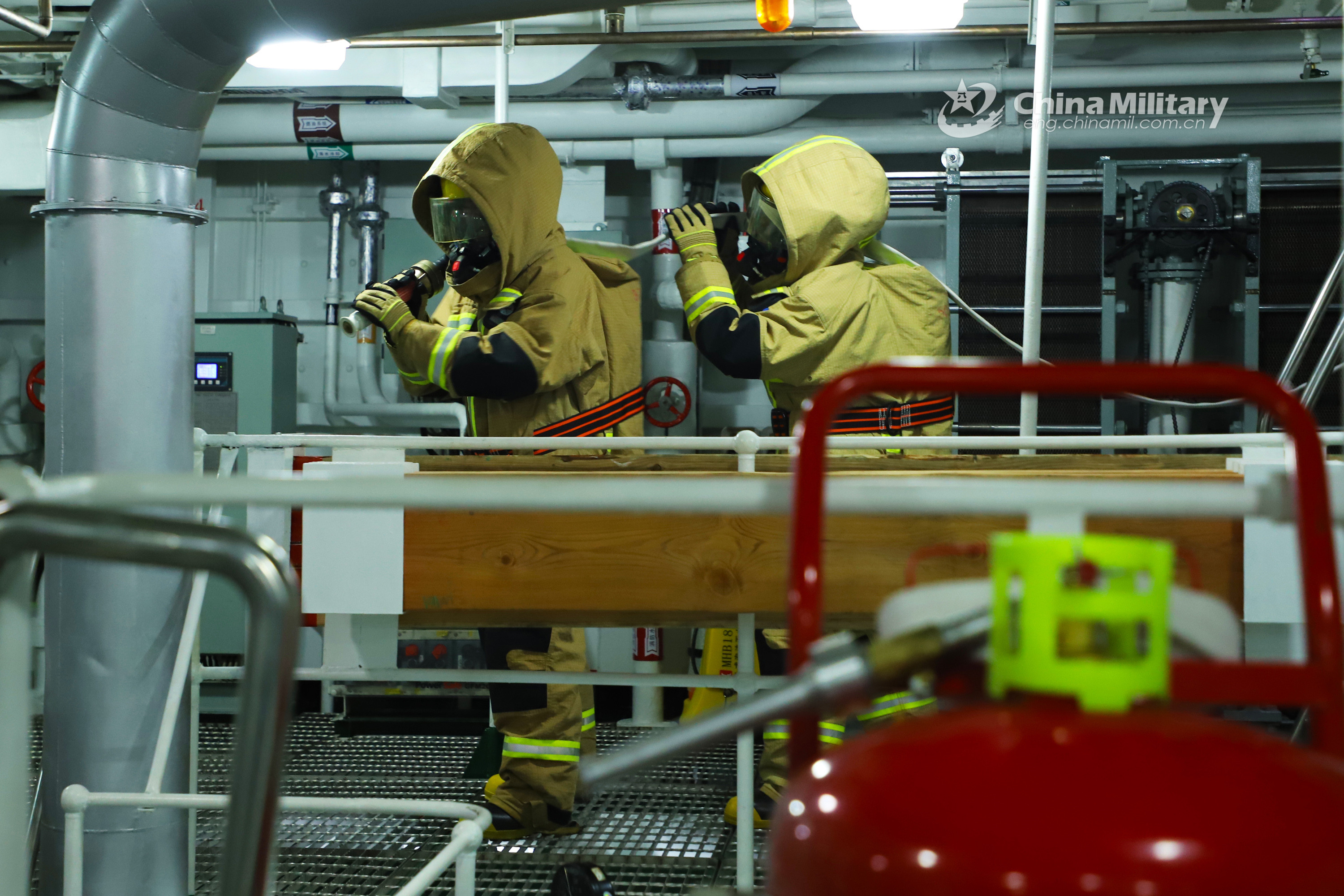 Sailors wearing Mission-Oriented Protective Posture (MOPP) gears man a hose in a damage control drill aboard the guided-missile destroyer Qiqihar (Hull 121) during a maritime training exercise in mid December, 2020. (eng.chinamil.com.cn/Photo by Zhang Hailong)