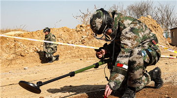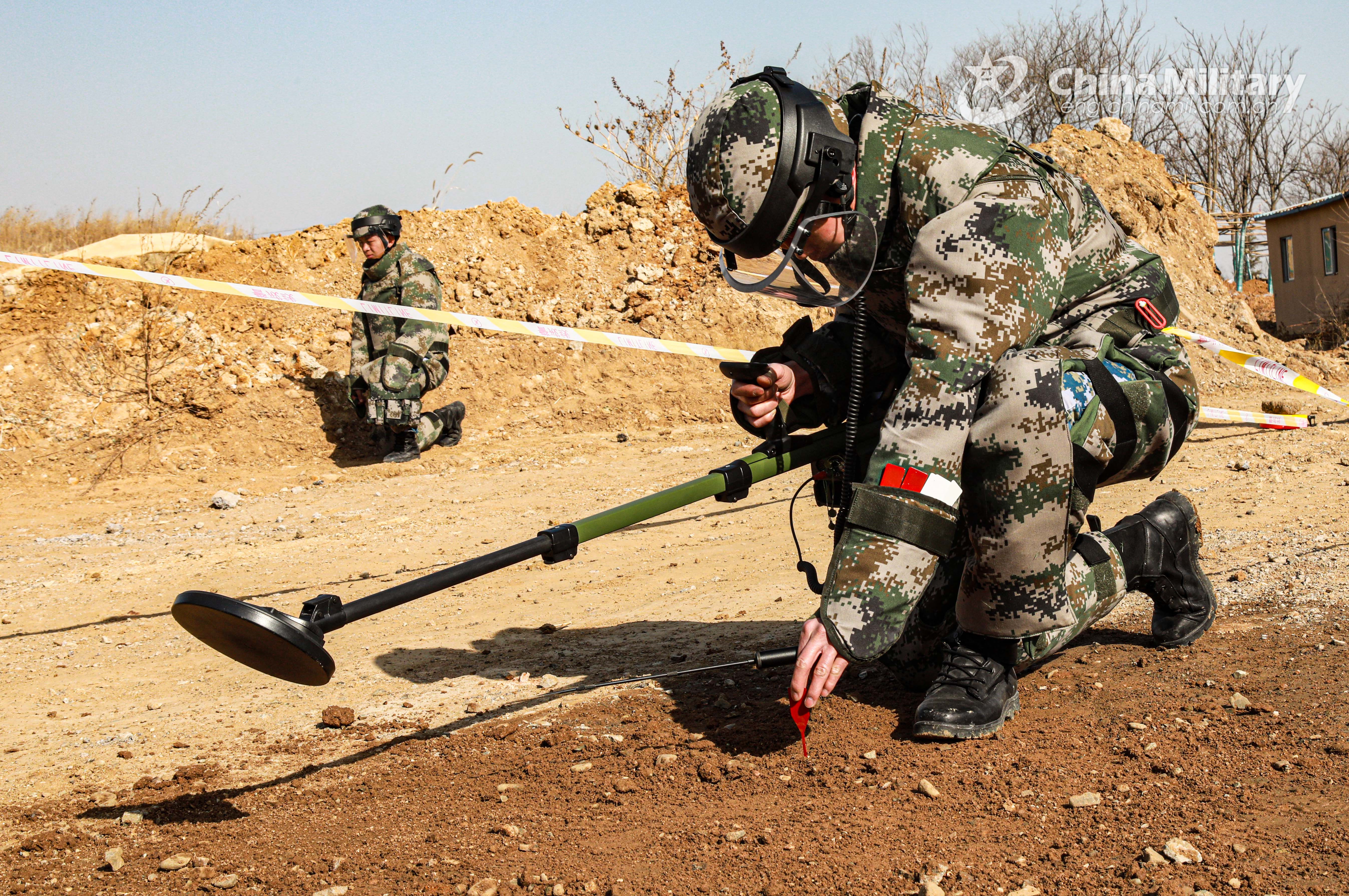 An Explosive Ordnance Disposal (EOD) soldier assigned to a barrier breaching company with a brigade under the PLA Navy Marine Corps marks a suspicious detonator during a minesweeping training exercise in a minefield on January, 29, 2021. (eng.chinamil.com.cn/Photo by Shang Wenbin)