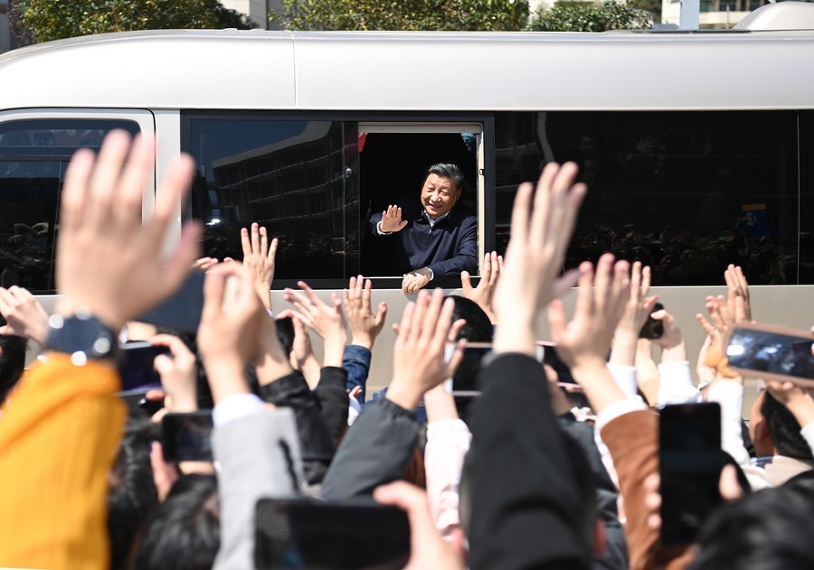 President Xi Jinping, also general secretary of the Communist Party of China Central Committee and chairman of the Central Military Commission, greets teachers and students during an inspection at Minjiang University in Fuzhou, Fujian Province, March 25, 2021. (Xinhua/Yan Yan)