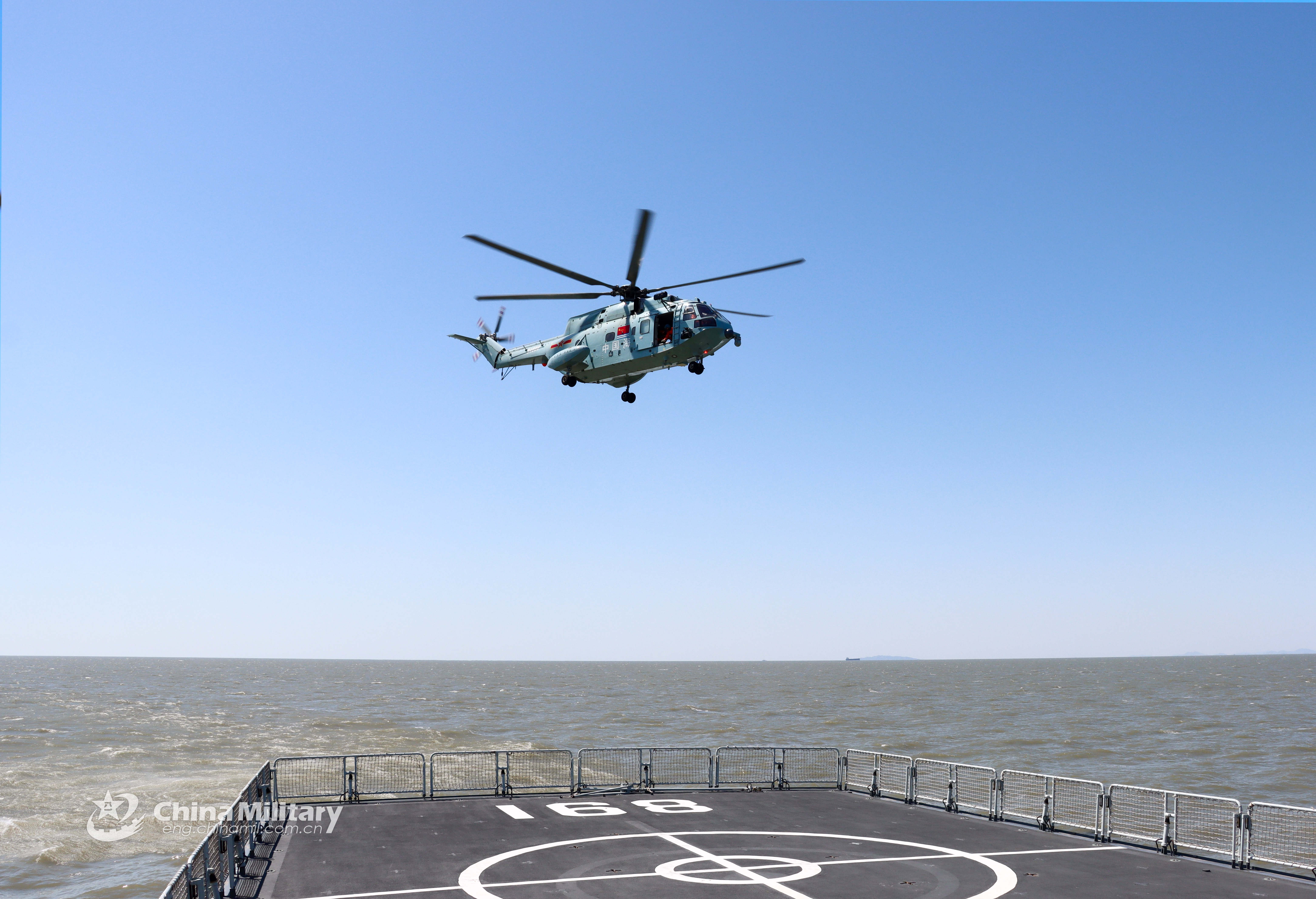 A ship-borne helicopter lifts off from the flight deck of a warship during a training exercise of landing and taking off from the ship's helipad on April 17, 2021. The training was jointly carried out by the units from a PLA Navy Testing Center and the Naval Aeronautical University. (eng.chinamil.com.cn/Photo by He Kuo)