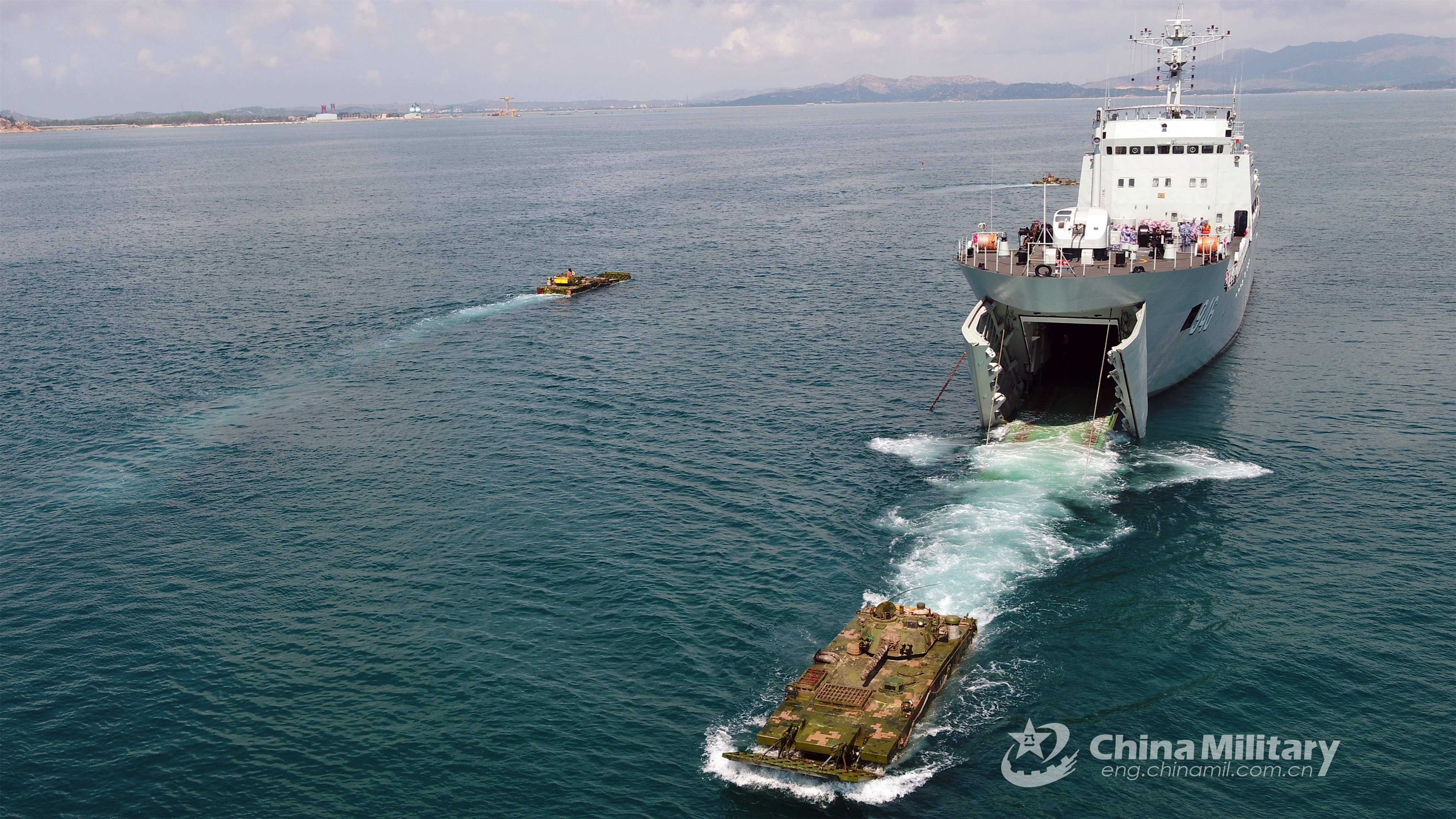 Two amphibious armored infantry fighting vehicles (IFVs) steer off the well deck of a landing ship and make their way into the sea during the several-week-long realistic combat training jointly conducted by a naval landing ship flotilla under the PLA Southern Theater Command and a combined arms brigade under the PLA 74th Group Army in mid-May, 2021. (eng.chinamil.com.cn/Photo by Lai Bingzhang)