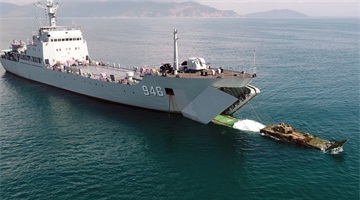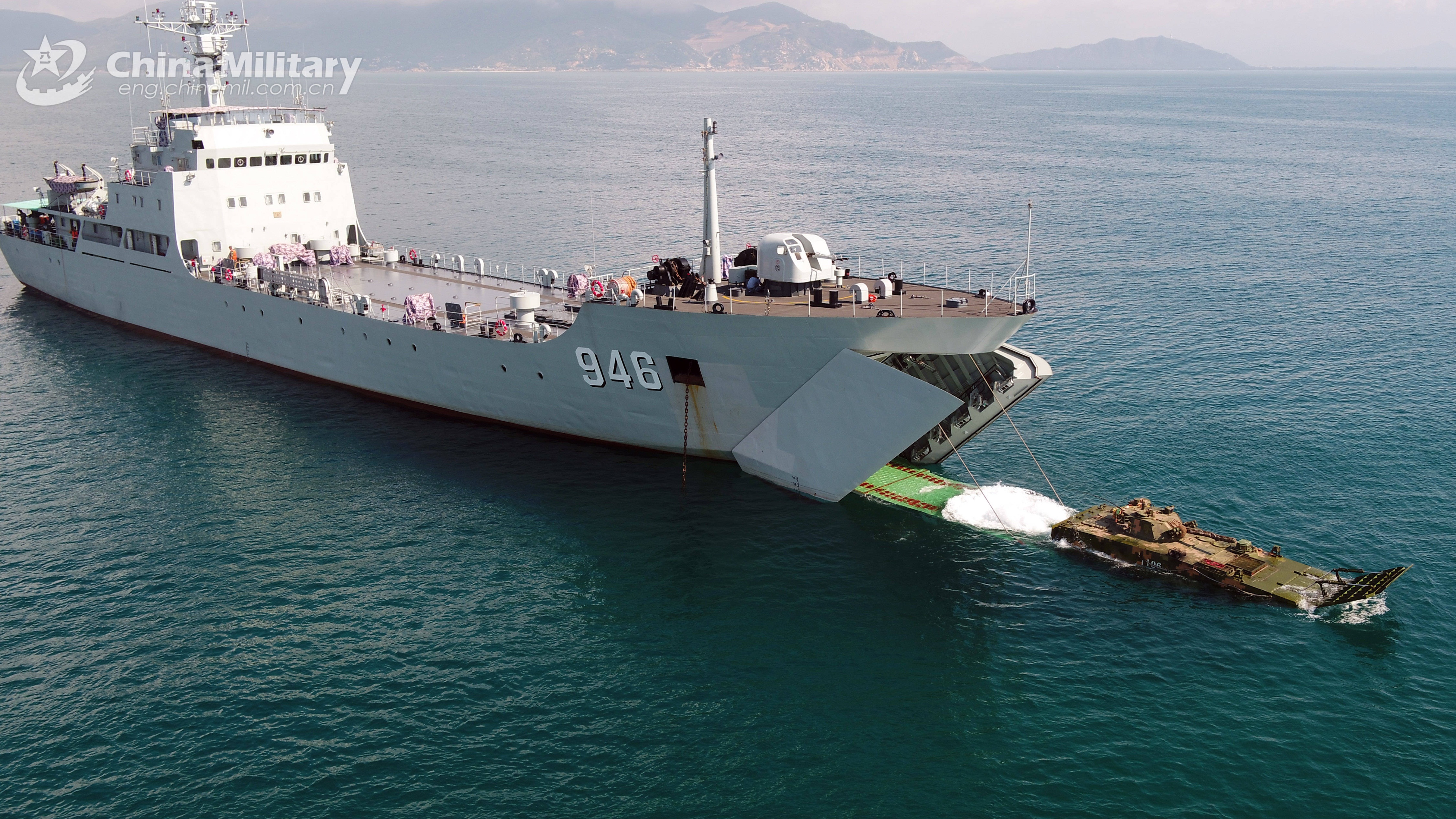 An amphibious armored infantry fighting vehicles (IFV) steers off the well deck of a landing ship during the several-week-long realistic combat training jointly conducted by a naval landing ship flotilla under the PLA Southern Theater Command and a combined arms brigade under the PLA 74th Group Army in mid-May, 2021. (eng.chinamil.com.cn/Photo by Lai Bingzhang)