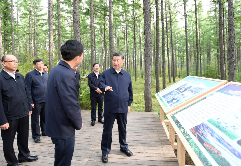 Chinese President Xi Jinping, also general secretary of the Communist Party of China Central Committee and chairman of the Central Military Commission, checks the growth of the trees and learns about the promotion of the Saihanba spirit and the high-quality development of the Saihanba forest farm at a forest named after Wang Shanghai, a late official of the farm, in north China's Hebei Province, Aug. 23, 2021. Xi made an inspection tour of the Saihanba forest farm on Monday. (Xinhua/Li Xueren)