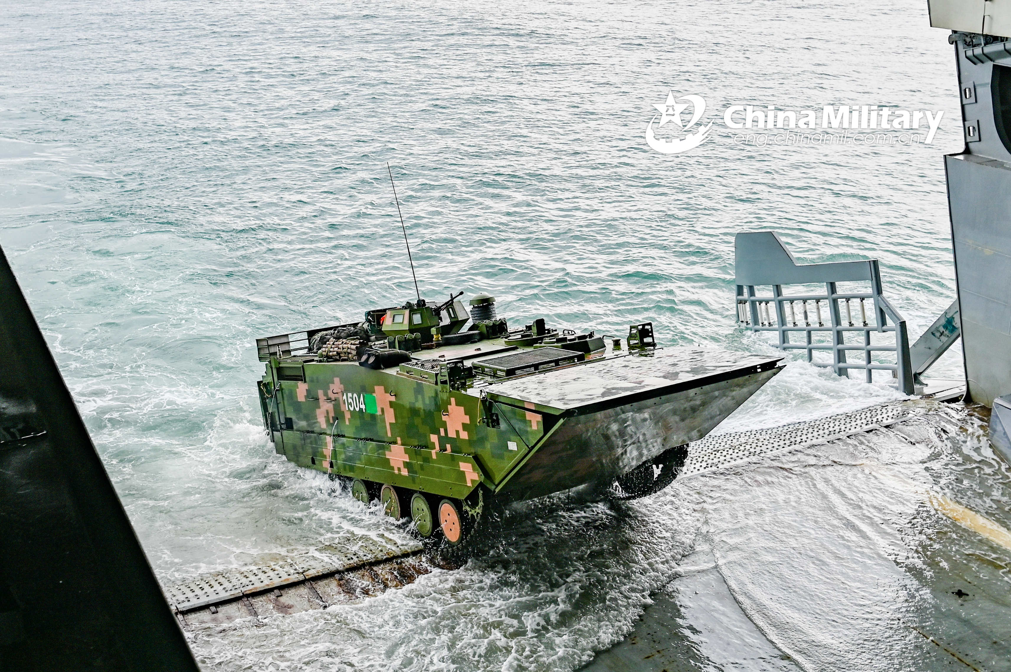 An amphibious infantry fighting vehicle attached to a brigade under the PLA 73rd Group Army practices landing and disembarking from the well deck of a landing ship during a maritime driving skill training exercise on August 9, 2021. (eng.chinamil.com.cn/Photo by Xu Mingzhang)