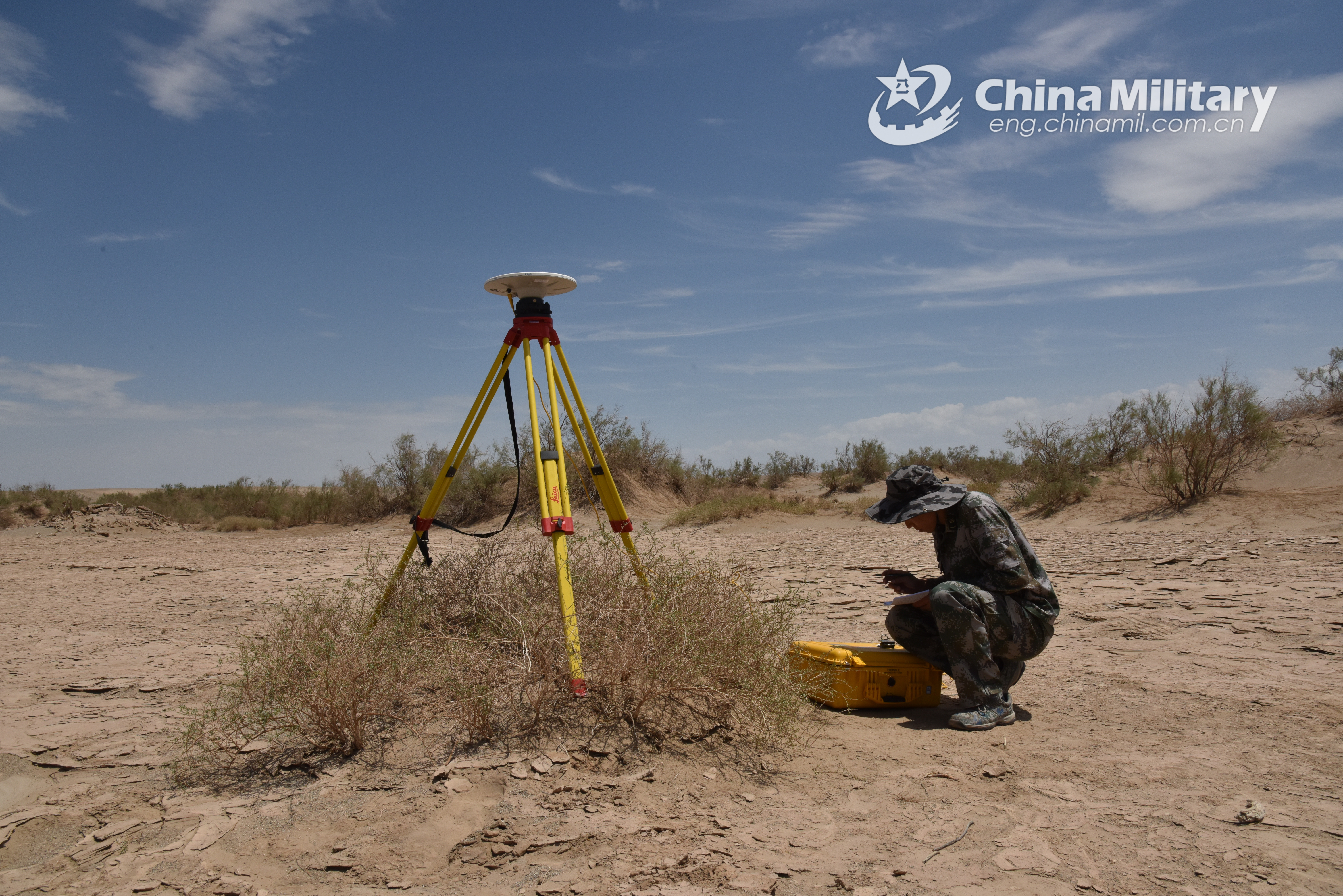 A soldier assigned to a unit with the PLA Strategic Support Force uses a measuring device to engage in survey task in the heat during a recent field training exercise in desert area. (eng.chinamil.com.cn/Photo by Hao Pengcheng and Xia Shaoxiong)