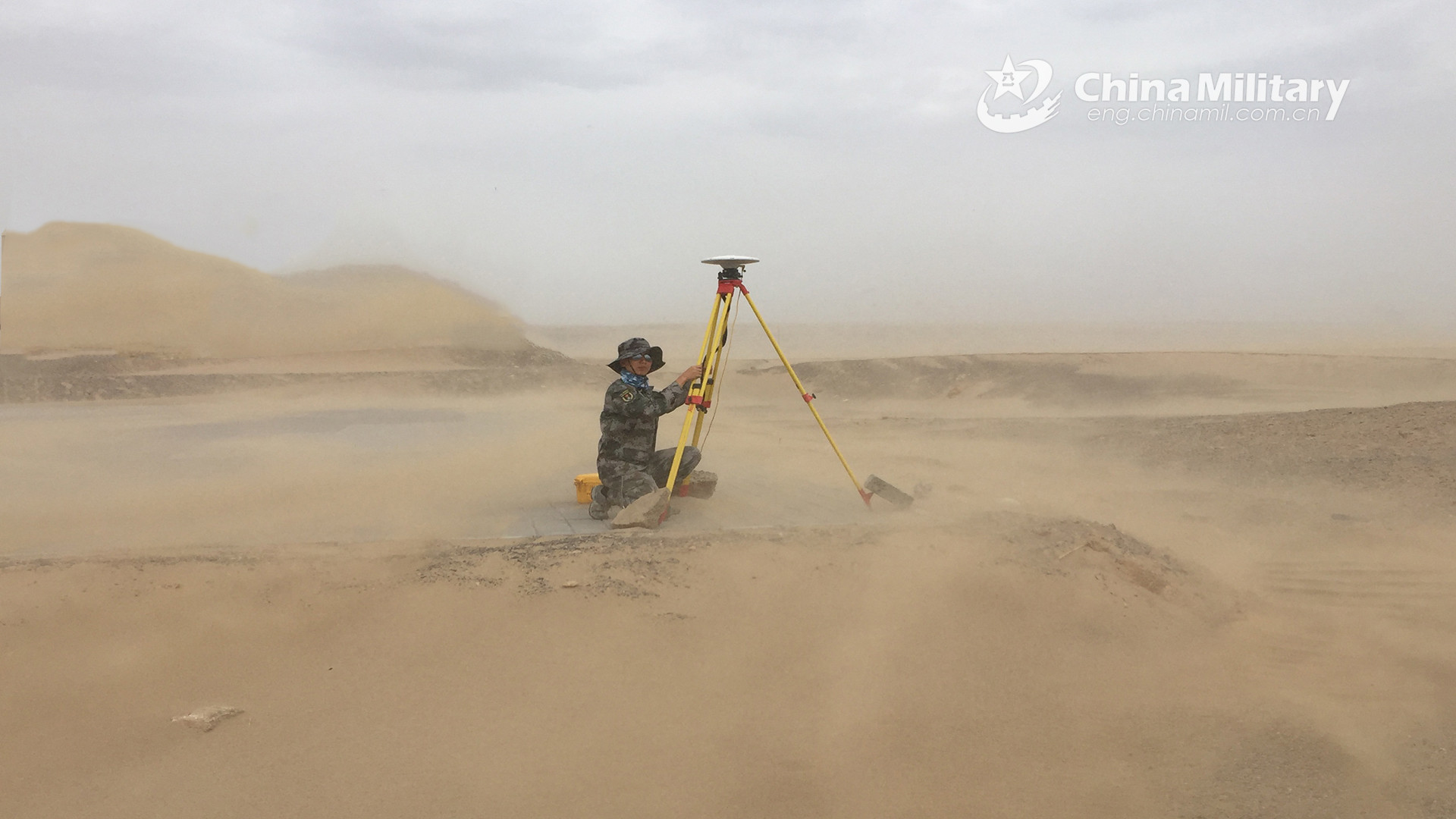 A soldier assigned to a unit with the PLA Strategic Support Force uses a measuring device to engage in survey task in the heat during a recent field training exercise in desert area. (eng.chinamil.com.cn/Photo by Hao Pengcheng and Xia Shaoxiong)