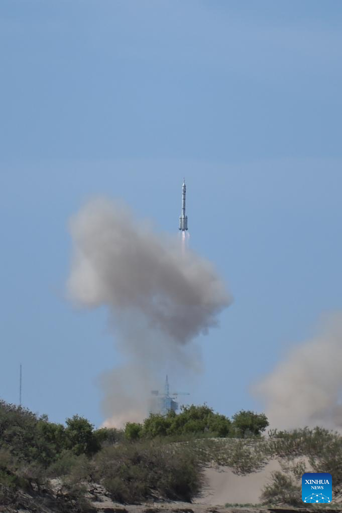 The crewed spaceship Shenzhou-14, atop a Long March-2F carrier rocket, is launched from the Jiuquan Satellite Launch Center in northwest China, June 5, 2022. About 577 seconds after the launch, Shenzhou-14 separated from the rocket and entered its designated orbit. The crew members are in good shape and the launch is a complete success. (Xinhua/Liu Lei)