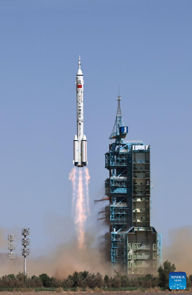 The crewed spaceship Shenzhou-14, atop a Long March-2F carrier rocket, is launched from the Jiuquan Satellite Launch Center in northwest China, June 5, 2022. (Xinhua/Li Gang)