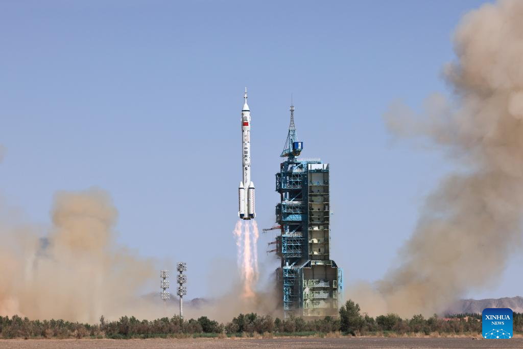 The crewed spaceship Shenzhou-14, atop a Long March-2F carrier rocket, is launched from the Jiuquan Satellite Launch Center in northwest China, June 5, 2022. About 577 seconds after the launch, Shenzhou-14 separated from the rocket and entered its designated orbit. The crew members are in good shape and the launch is a complete success. (Xinhua/Li Gang)