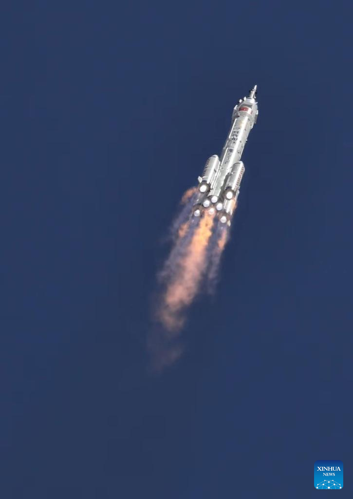 The crewed spaceship Shenzhou-14, atop a Long March-2F carrier rocket, is launched from the Jiuquan Satellite Launch Center in northwest China, June 5, 2022. About 577 seconds after the launch, Shenzhou-14 separated from the rocket and entered its designated orbit. The crew members are in good shape and the launch is a complete success. (Xinhua/Li Gang)