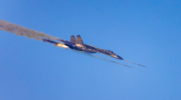A fighter jet attached to an aviation brigade of the air force under the PLA Southern Theater Command flies away from the simulated aerial combat zone during a live-fire training exercise on December 8, 2022. (eng.chinamil.com.cn/Photo by Liu Hang)