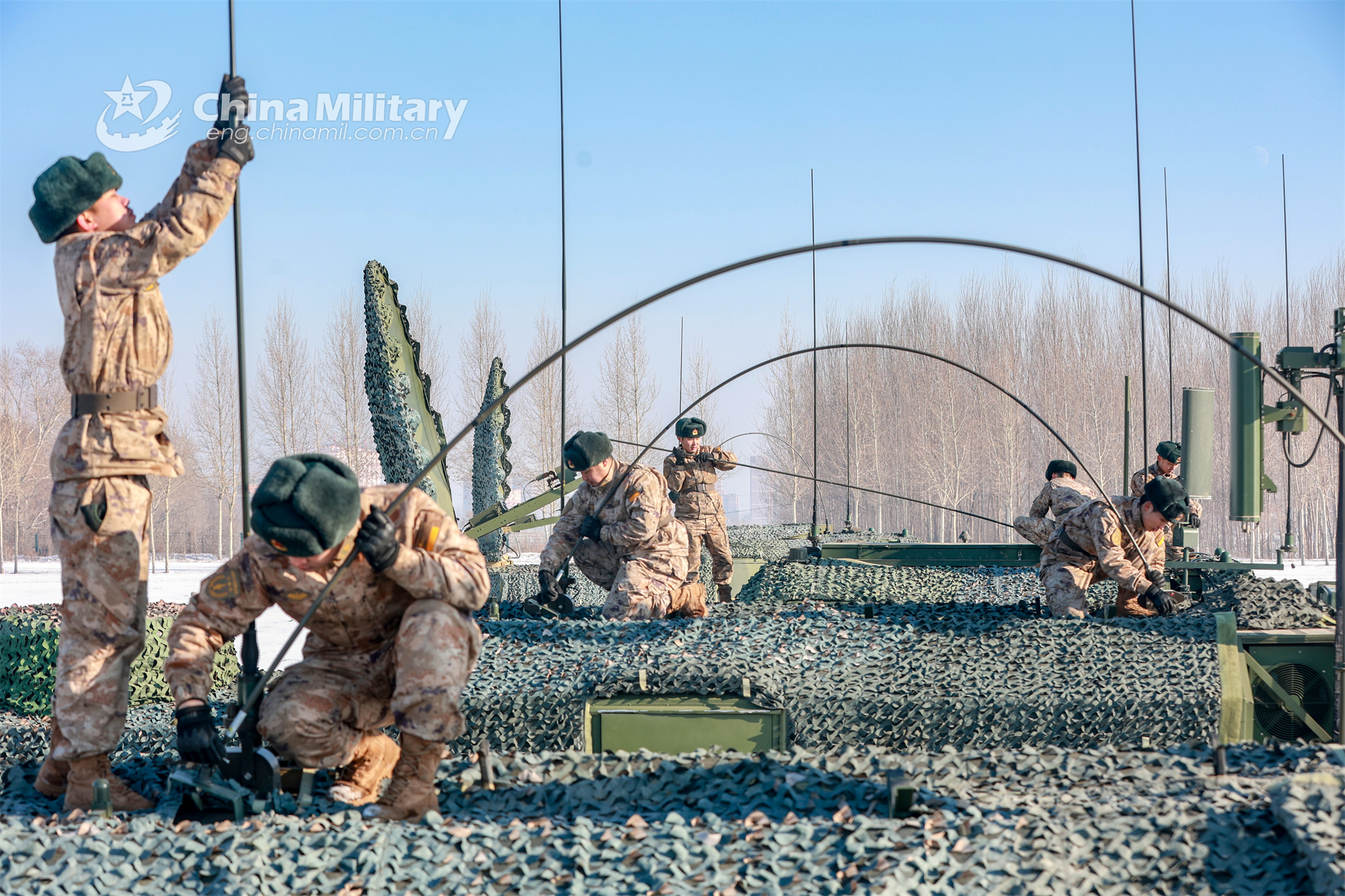 Soldiers assigned to a communication battalion under the PLA Rocket Force use a device to detect wind velocity and direction during a wireless communication exercise in freezing conditions, in a bid to enhance their field communication support ability. (eng.chinamil.com.cn/Photo by Lin Ze)
