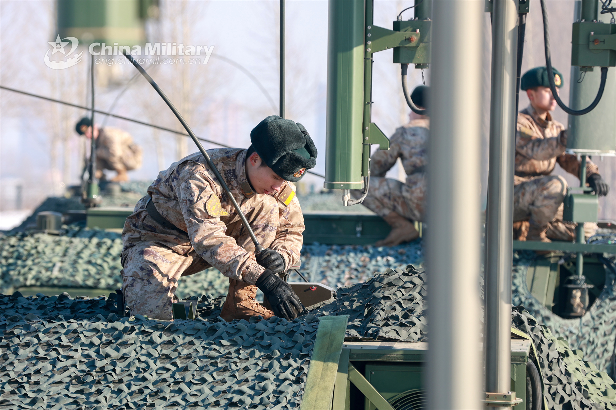 Soldiers assigned to a communication battalion under the PLA Rocket Force use a device to detect wind velocity and direction during a wireless communication exercise in freezing conditions, in a bid to enhance their field communication support ability. (eng.chinamil.com.cn/Photo by Lin Ze)