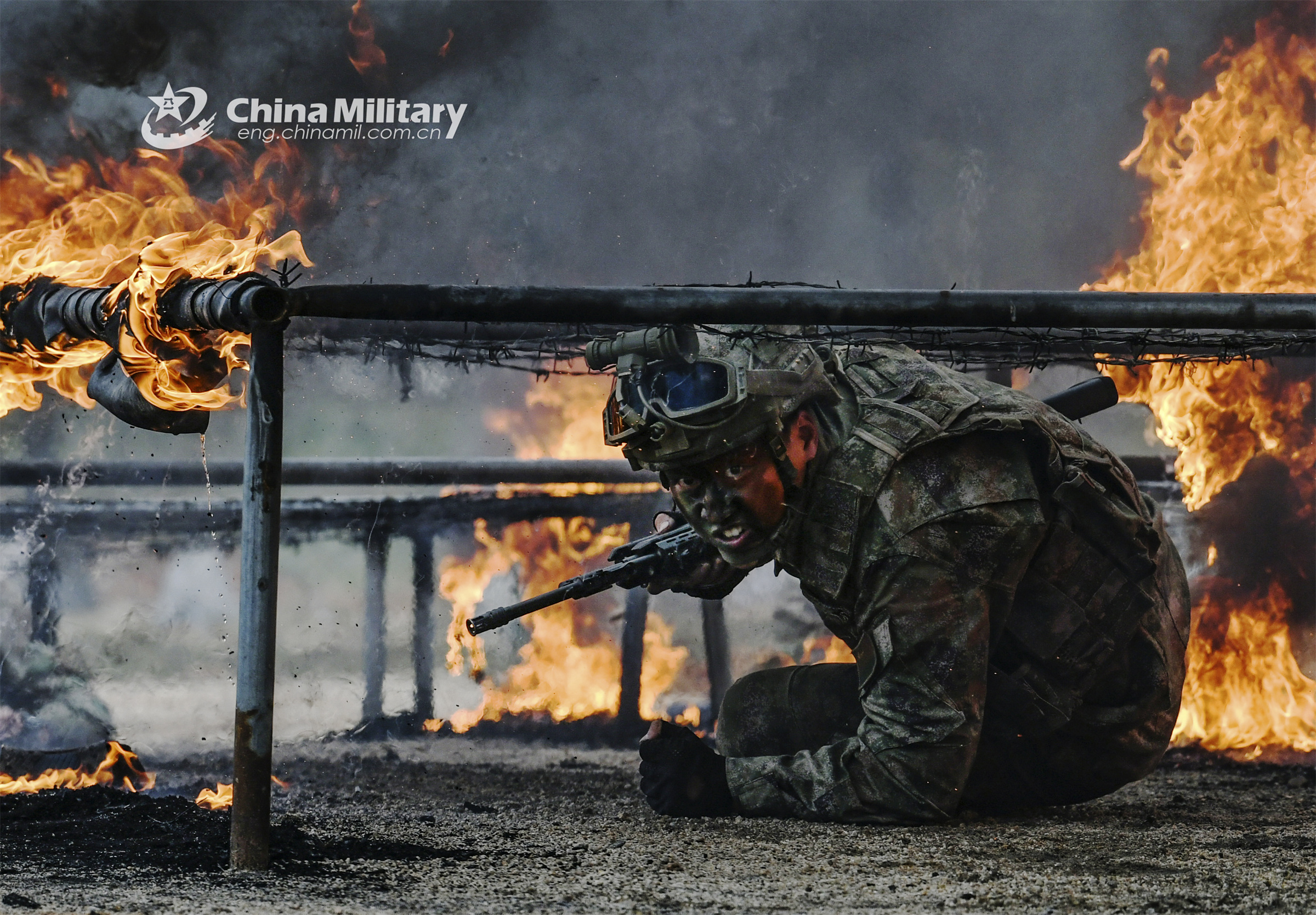 A soldier assigned to a brigade under the PLA 73rd Group Army crawls through a fire obstacle during an individual tactical training exercise on February 3, 2023. (eng.chinamil.com.cn/Photo by Chen Xuhui)