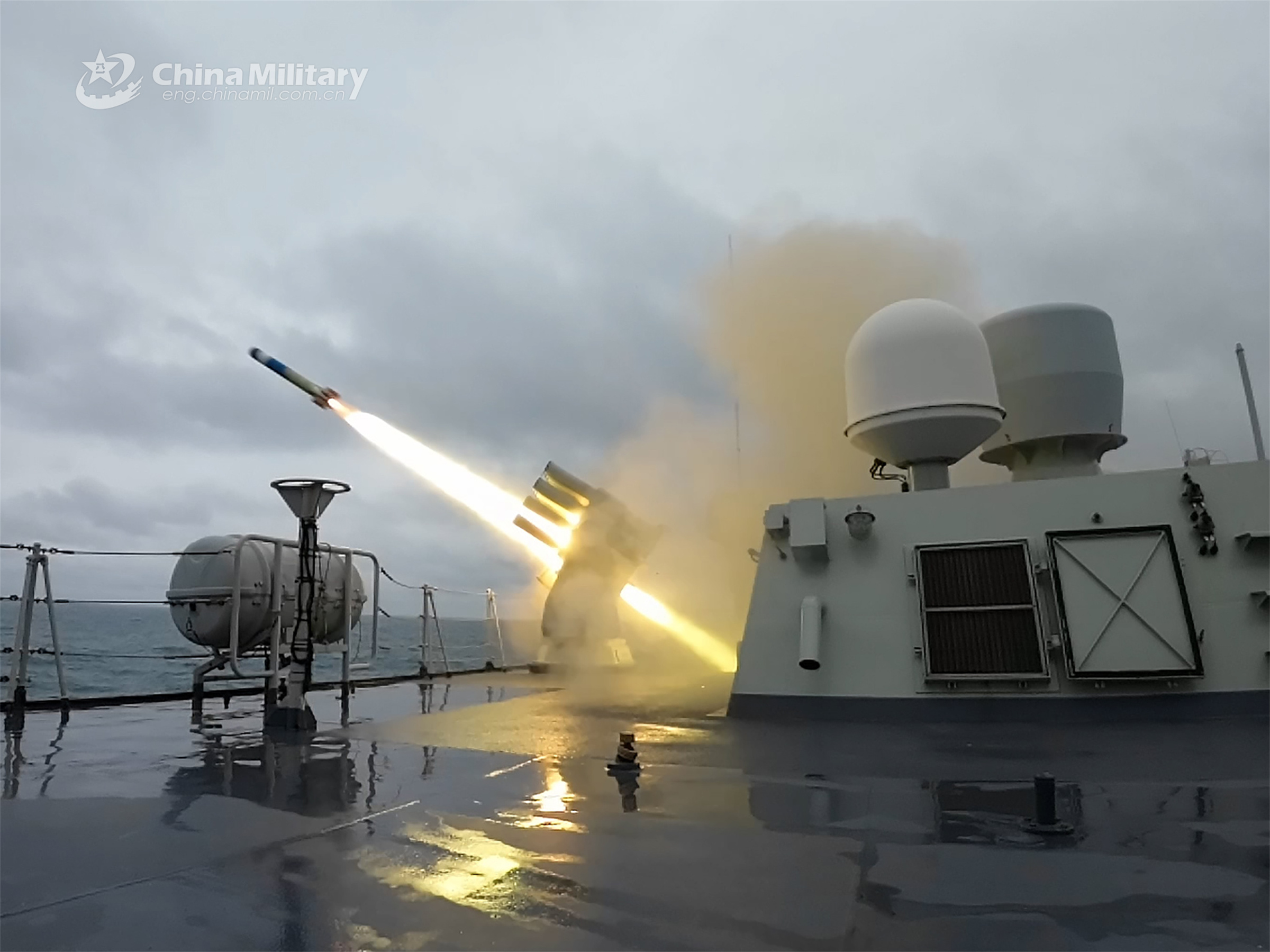 A guided-missile frigate attached to a naval destroyer flotilla under the PLA Eastern Theater Command fires a jamming shell during a multi-subject training exercise held in late February, 2023. (eng.chinamil.com.cn/Photo by Jiang Xia)