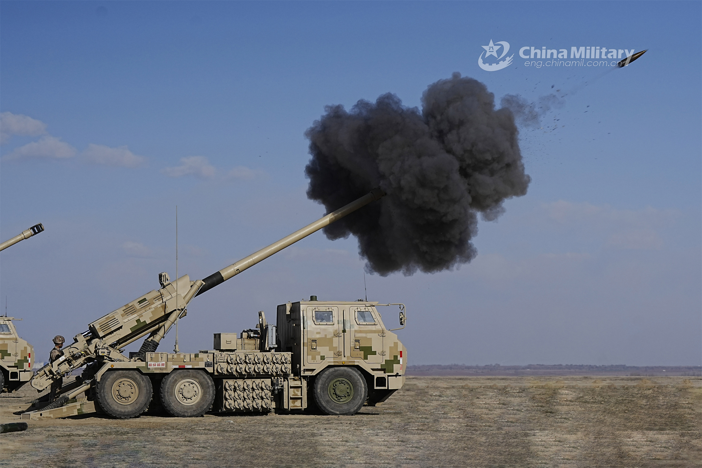Truck-mounted artillery systems attached to an artillery element with a regiment under the PLA Xinjiang Military Command fire at mock targets during a field live-fire training exercise in mid-April, 2023. (eng.chinamil.com.cn/Photo by Zhou Yubin)