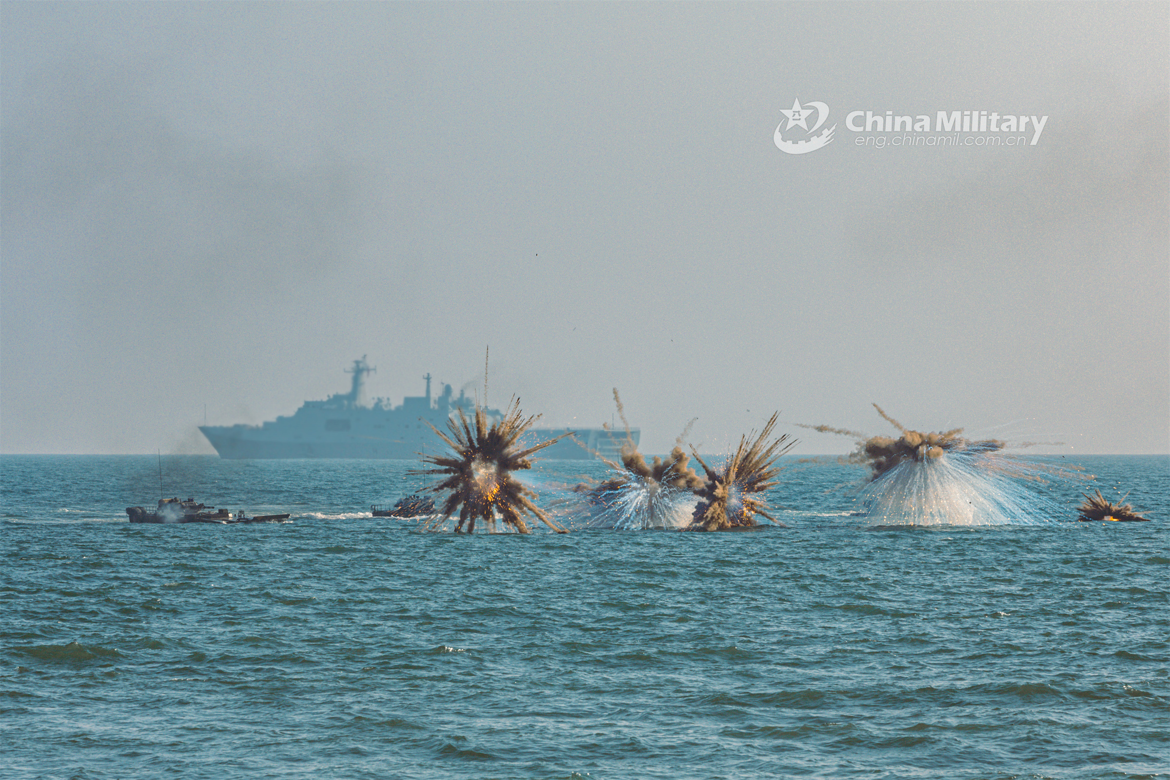 Amphibious armored vehicles attached to a brigade of the PLA 74th Group Army release smoke bombs for concealment during a recent amphibious training exercise. (eng.chinamil.com.cn/Photo by Li Bin)