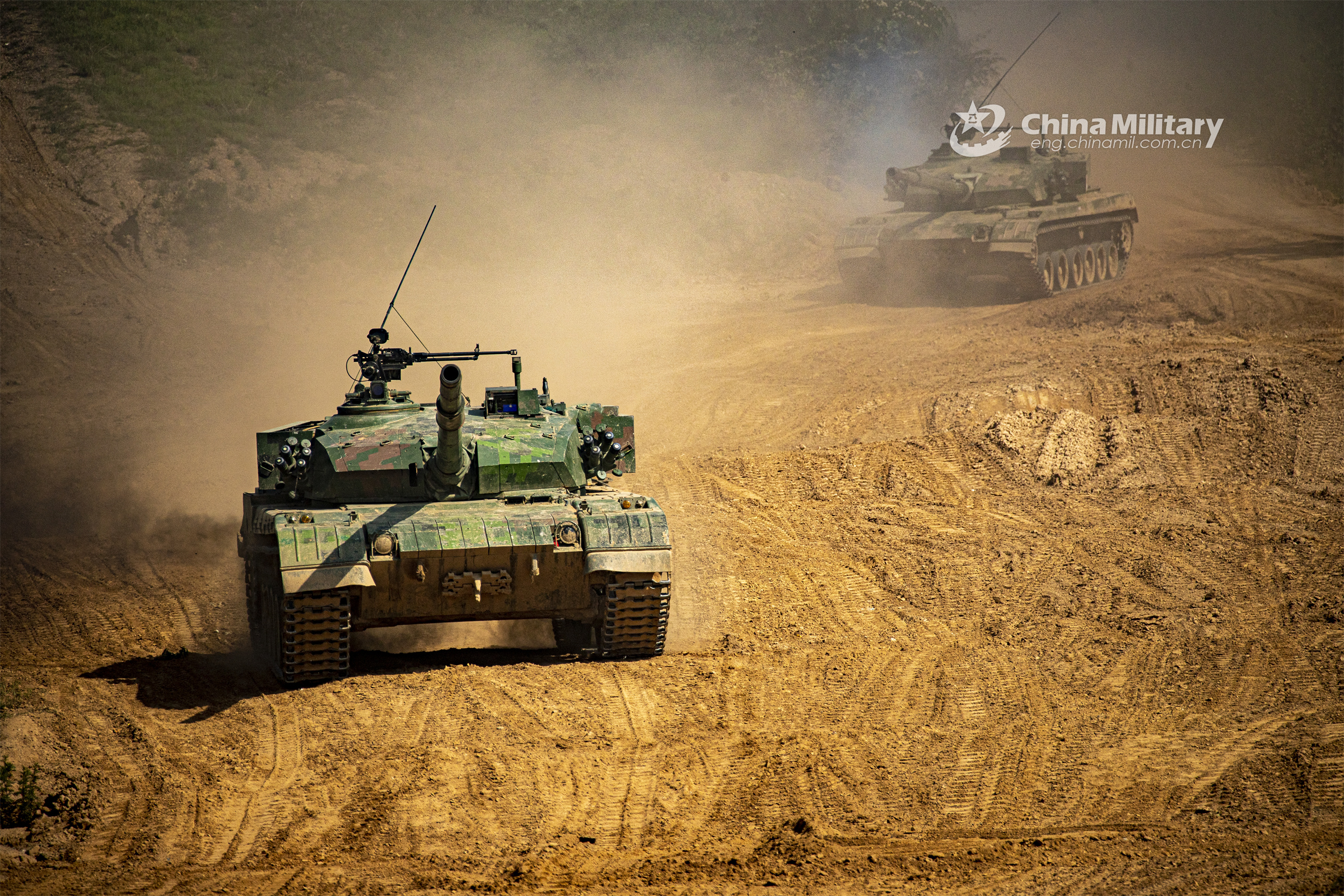 Main battle tanks attached to a combined-arms battalion of a brigade under the PLA 71st Group Army kick up plumes of dust during a round-the-clock live-fire tactical training exercise in early June, 2023. (eng.chinamil.com.cn/Photo by Wan Zhiqi)