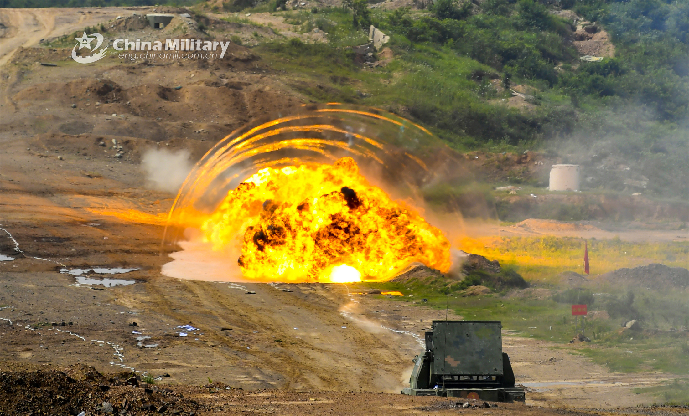 Mine-clearing vehicle attached to a combined-arms brigade under the PLA 71st Group Army detonates explosives to clear the path during explosive ordnance disposal training on June 18, 2023. (eng.chinamil.com.cn/Photo by Yao Zongkai)