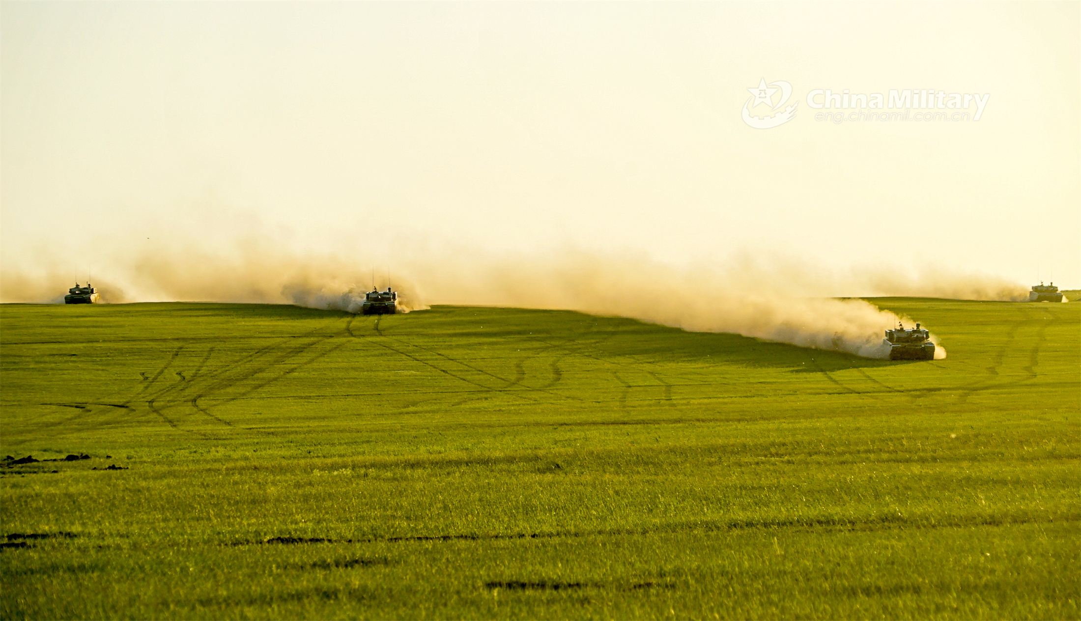 Main battle tanks (MBTs) attached to a brigade under the PLA 82nd Group Army kick up plumes of dust as they move forward to the designated area during a maneuvering training exercise in the Gobi desert in late June, 2023. (eng.chinamil.com.cn/Photo by Sun Tongkai)