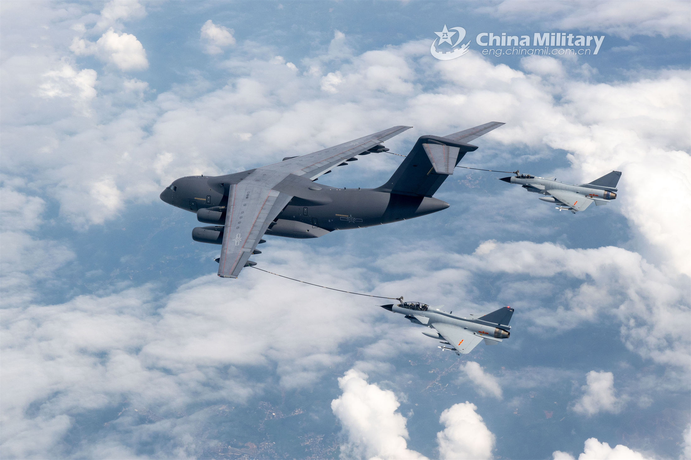 A YY-20 tanker attached to an aviation brigade of the air force under the PLA Southern Theater Command refuels two J-10 fighter jets at the same time during a recent flight training exercise. (eng.chinamil.com.cn/Photo by Qiang Teng)