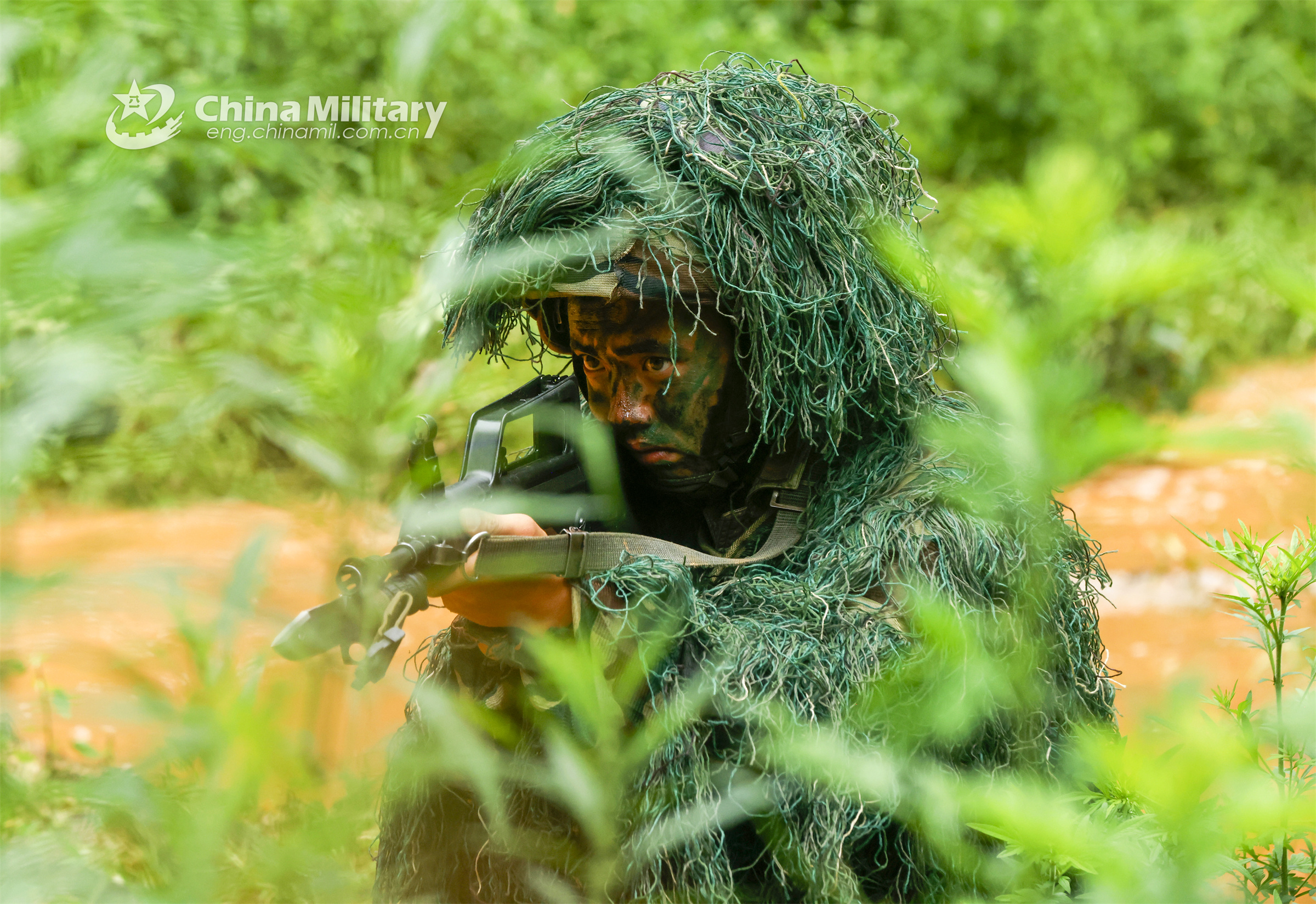 A sniper wearing ghillie suit assigned to a brigade under the PLA 75th Group Army engages mock targets during a tactical training exercise on August 4, 2023. (eng.chinamil.com.cn/Photo by Yang Zhao)