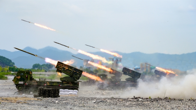 A battery of multiple launch rocket systems attached to anartillery element of a brigade under the PLA 73rd Group Army fire at targets during a live fire training exercise. The exercise was held at an unfamiliar territory in September. (eng.chinamil.com.cn/Photo by Liu Pengfei)