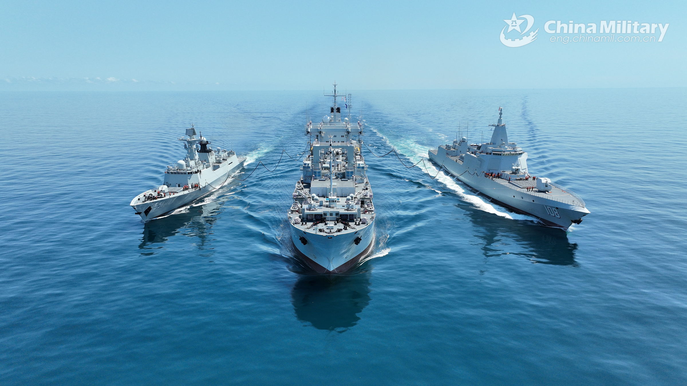 Warships attached to a combat support ship flotilla of the navy under the PLA Southern Theater Command steam in formation to conduct alongside replenishment-at-sea during a comprehensive replenishment training exercise on September 22, 2023. (eng.chinamil.com.cn/Photo by Peng Jun)