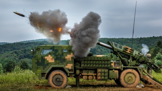 A vehicle-mounted howitzer attached to a brigade under the PLA 75th Group Army fires at mock targets during a live-fire training exercise on November 9, 2023. (eng.chinamil.com.cn/Photo by Zhai Xuesheng)