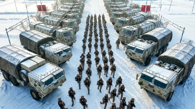 Soldiers assigned to a transport brigade of the Chinese People's Liberation Army Joint Logistic Support Force march toward the training field on January 2 for their first training exercise in 2024. (eng.chinamil.com.cn/Photo by Zhao Jiaqing)