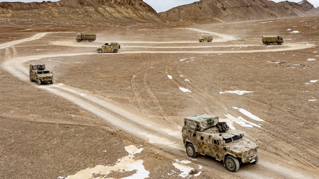 A military truck convoy attached to a regiment under the PLA Xinjiang Military Command moves on a zigzag road in unfamiliar area during a driving skill training exercise in early February, 2024. (eng.chinamil.com.cn/Photo by Yang Qi)