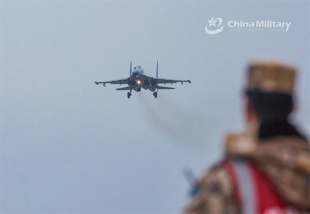 A fighter jet attached to an aviation brigade with the air force under the PLA Eastern Theater Command unfolds landing gear before landing during a flight training exercise held on March 2, 2024. (eng.chinamil.com.cn/Photo by Huang Guotai)