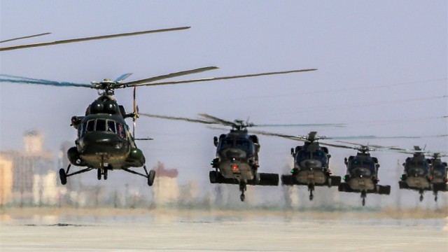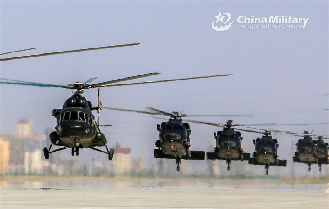 Helicopters attached to a brigade under the PLA 76th Group Army hover at an ultra-low altitude before a round-the-clock flight training exercise on April 27, 2024. (eng.chinamil.com.cn/Photo by Li Xiaoxiao)