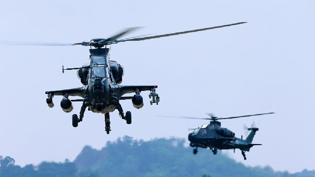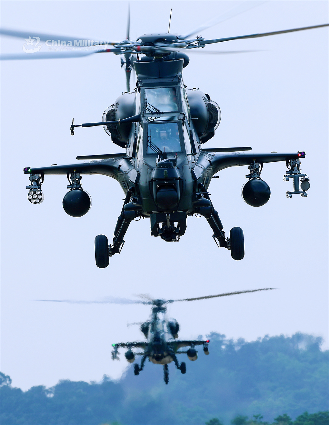 Attack helicopters attached to a brigade under the PLA 75th Group Army get ready to land after a flight training exercise on May 17, 2024. (eng.chinamil.com.cn/Photo by Tan Yanglin)