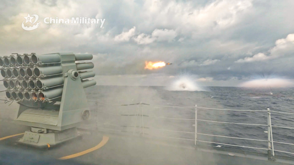 A naval vessel attached to a flotilla of the PLA Navy fires a jamming shell during a multi-subject maritime training exercise on June 11, 2024. (eng.chinamil.com.cn/Photo by Ge Hanqiang)