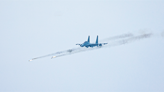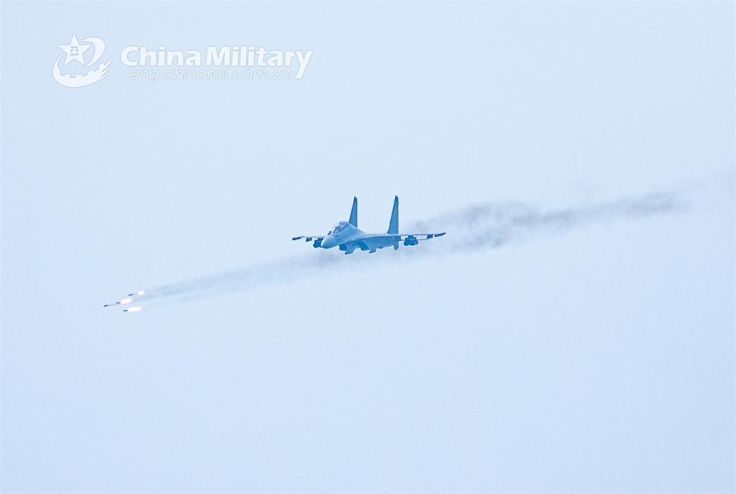 A fighter jet attached to an aviation brigade with the air force under PLA Northern Theater Command fires rockets at ground target during a live-fire training exercise on June 14, 2024. (eng.chinamil.com.cn/Photo by Wang Hao)