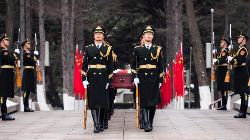 The burial ceremony began at the CPV martyrs' cemetery in Shenyang at 10 a.m. With the national anthem playing, the guards of honor carrying the caskets of the fallen martyrs entered the cemetery.