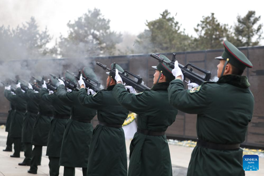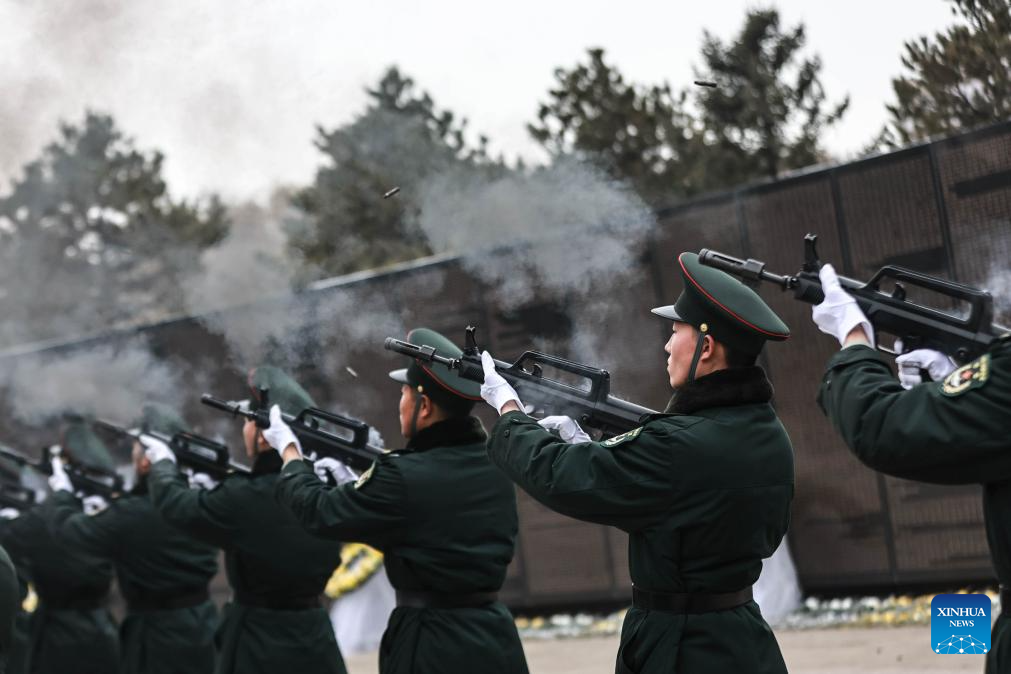Soldiers fire a gun salute during a burial ceremony for the remains of the fallen Chinese People's Volunteers (CPV) martyrs at the CPV martyrs' cemetery in Shenyang, northeast China's Liaoning Province, Nov. 29, 2024. The remains of 43 Chinese People's Volunteers (CPV) soldiers who lost their lives during the War to Resist U.S. Aggression and Aid Korea (1950-1953) were laid to rest on Friday in Shenyang, capital of northeast China's Liaoning Province.