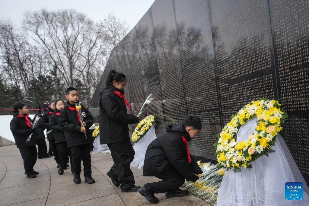 Students line up to present flowers to the memorial wall of Chinese People's Volunteers (CPV) martyrs at the CPV martyrs' cemetery in Shenyang, northeast China's Liaoning Province, Nov. 29, 2024. The remains of 43 Chinese People's Volunteers (CPV) soldiers who lost their lives during the War to Resist U.S. Aggression and Aid Korea (1950-1953) were laid to rest on Friday in Shenyang, capital of northeast China's Liaoning Province.